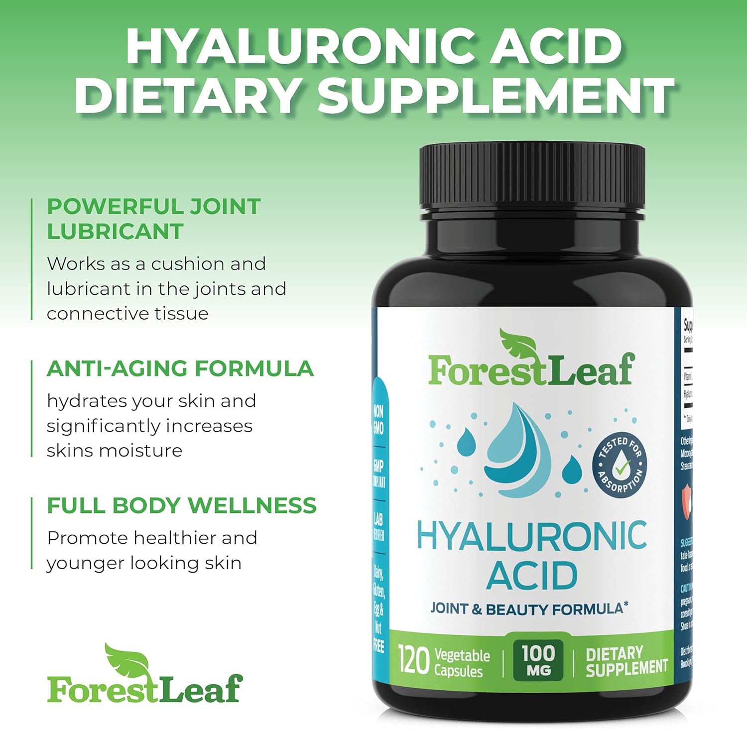 Forestleaf - Hyaluronic Acid Supplements - 120 Vegetable Capsules - 100Mg Dietary Hyaluronic Acid + 50Mg Vitamin C Joint & Anti Aging Beauty Formula - Supports Skin Hydration, Joints, Bones & Hair