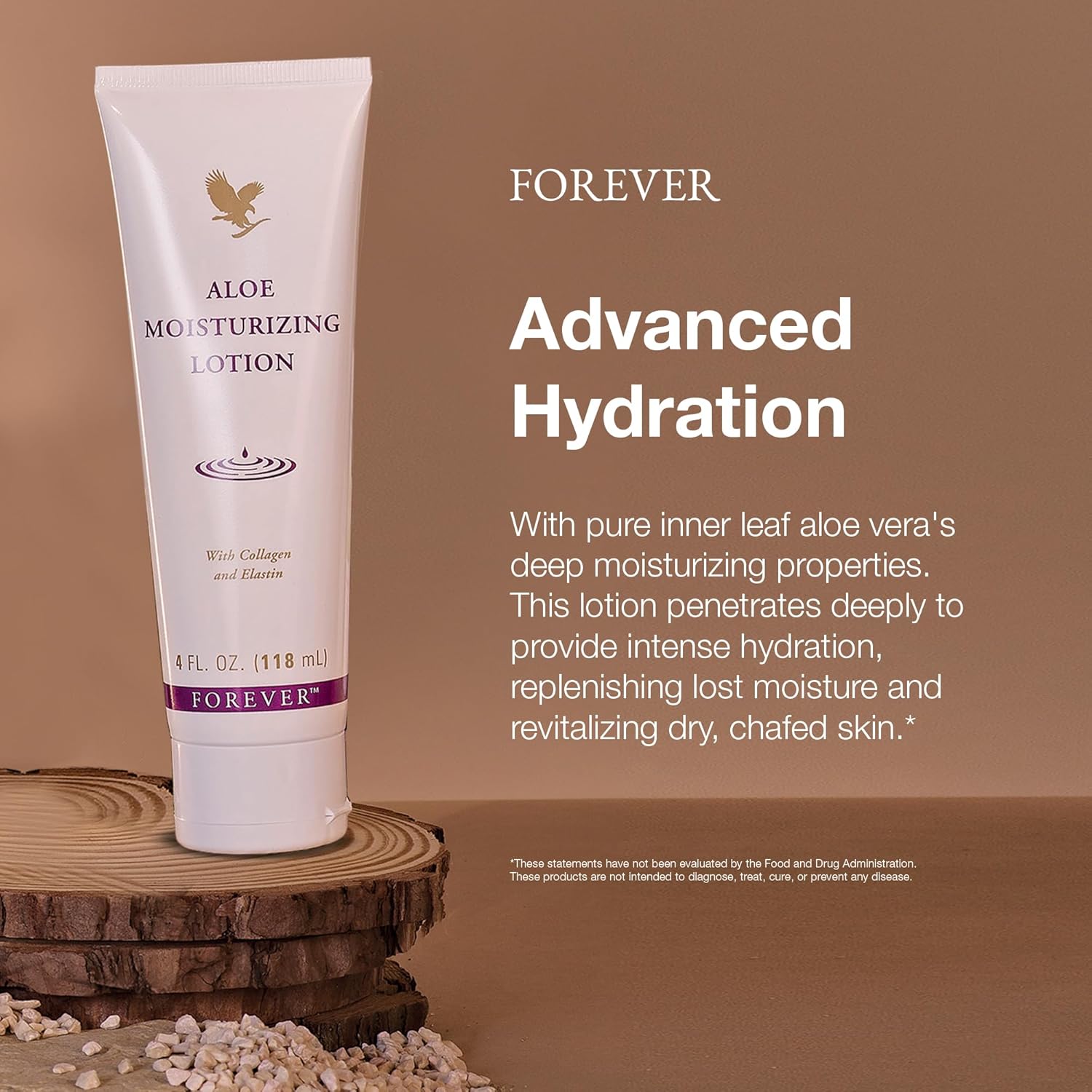 About this item Advanced Hydration: With pure inner leaf aloe vera's deep moisturizing properties. This lotion penetrates deeply to provide intense hydration, replenishing lost moisture and revitalizing dry, chafed skin. Skin Elasticity: Enriched with collagen and elastin, this lotion goes beyond simple hydration to improve the overall feel and elasticity of your skin. Collagen and elastin work together to promote skin suppleness. Luxurious Texture: Experience the indulgent texture of this lotion, which glides smoothly onto the skin. Its rich consistency feels lavish and comforting, providing a pampering experience with every application. Versatile Use: Suitable for both hands and body, Forever Aloe Moisturizing Lotion is a versatile skincare. Targets rough patches on your hands or dry areas on your body, this lotion delivers targeted hydration. Quality Ingredients: Including apricot kernel oil, jojoba, and vitamin E, this lotion nourishes and conditions the skin. It's free from gluten and suitable for a wide range of skin types, including sensitive skin. Forever makes no claim that its products cure or prevent any diseases or are a substitute for medical advice or therapy. Conduct a patch test if uncertain about sensitivity and consult a healthcare professional during pregnancy. Products are for external use only. See more product details,Advanced Hydration: With pure inner leaf aloe vera's deep moisturizing properties. This lotion penetrates deeply to provide intense hydration, replenishing lost moisture and revitalizing dry, chafed skin,Skin Elasticity: Enriched with collagen and elastin, this lotion goes beyond simple hydration to improve the overall feel and elasticity of your skin. Collagen and elastin work together to promote skin suppleness,Luxurious Texture: Experience the indulgent texture of this lotion, which glides smoothly onto the skin. Its rich consistency feels lavish and comforting, providing a pampering experience with every application,Versatile Use: Suitable for both hands and body, Forever Aloe Moisturizing Lotion is a versatile skincare. Targets rough patches on your hands or dry areas on your body, this lotion delivers targeted hydration,Quality Ingredients: Including apricot kernel oil, jojoba, and vitamin E, this lotion nourishes and conditions the skin. It's free from gluten and suitable for a wide range of skin types, including sensitive skin,Forever makes no claim that its products cure or prevent any diseases or are a substitute for medical advice or therapy. Conduct a patch test if uncertain about sensitivity and consult a healthcare professional during pregnancy. Products are for external use only