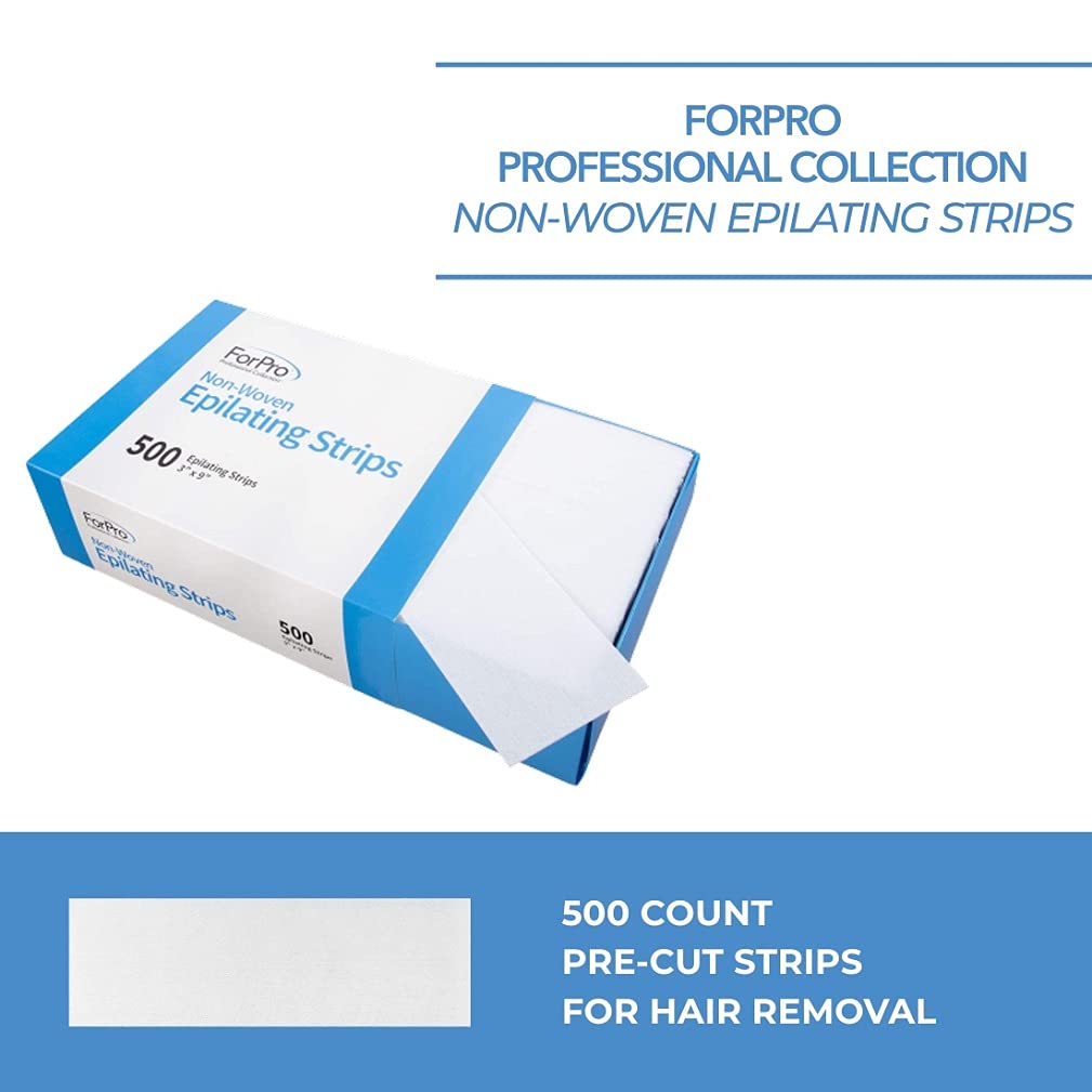 About this item Epilating Strips: ForPro non-woven epilating strips are the professional choice for all depilatory services. They feature an extra-soft calendering process. Waxing Strips: The epilating strips are designed for all wax removal applications. These lint-free & tear-resistant pre-cut waxing strips are made from fine grade weaves that offer maximum absorption & precise hair removal. Non-Woven Strips: The medium thickness of these waxing strips are perfect for removing hair from legs, arms, back, and other large areas of the body. Hair Removal Waxing Strips: The pre-cut epilating strips are durable and will not separate or tear during use. Size & Quantity: The white non-woven epilating strips measure 3" W x 9" L each and come in a pack of 500 hair removal waxing strips.  See more product details,Epilating Strips: ForPro non-woven epilating strips are the professional choice for all depilatory services. They feature an extra-soft calendering process,Waxing Strips: The epilating strips are designed for all wax removal applications. These lint-free & tear-resistant pre-cut waxing strips are made from fine grade weaves that offer maximum absorption & precise hair removal,Non-Woven Strips: The medium thickness of these waxing strips are perfect for removing hair from legs, arms, back, and other large areas of the body,Hair Removal Waxing Strips: The pre-cut epilating strips are durable and will not separate or tear during use,Size & Quantity: The white non-woven epilating strips measure 3" W x 9" L each and come in a pack of 500 hair removal waxing strips