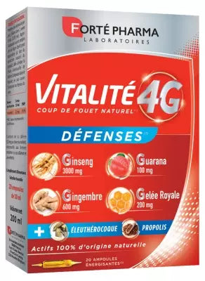 Forté Pharma Vitality 4G Defences 20 Phialsis A Dietary Supplement That Naturally Revitalizes The Body. Its Formula Is Based On The 4G Complex, A Synergy Of 4 Ideally Dosed Active Ingredients: Ginseng, Guarana, Royal Jelly And Ginger, Combined With Acerola, A Source Of Vitamin C Of Natural Origin, To Boost Your Energy. Two Specific Active Ingredients Complete The Formula: Eleutherococcus, Siberian Ginseng Known To Contribute To Better Mental And Physical Energy. It Contributes To The Normal Functioning Of The Immune System; Propolis, A Substance Produced By Bees That Protects The Hive From External Aggressions. No Coloring, No Preservative, No Sweetener, No Added Sugar. Gluten-Free, Gelatin-Free