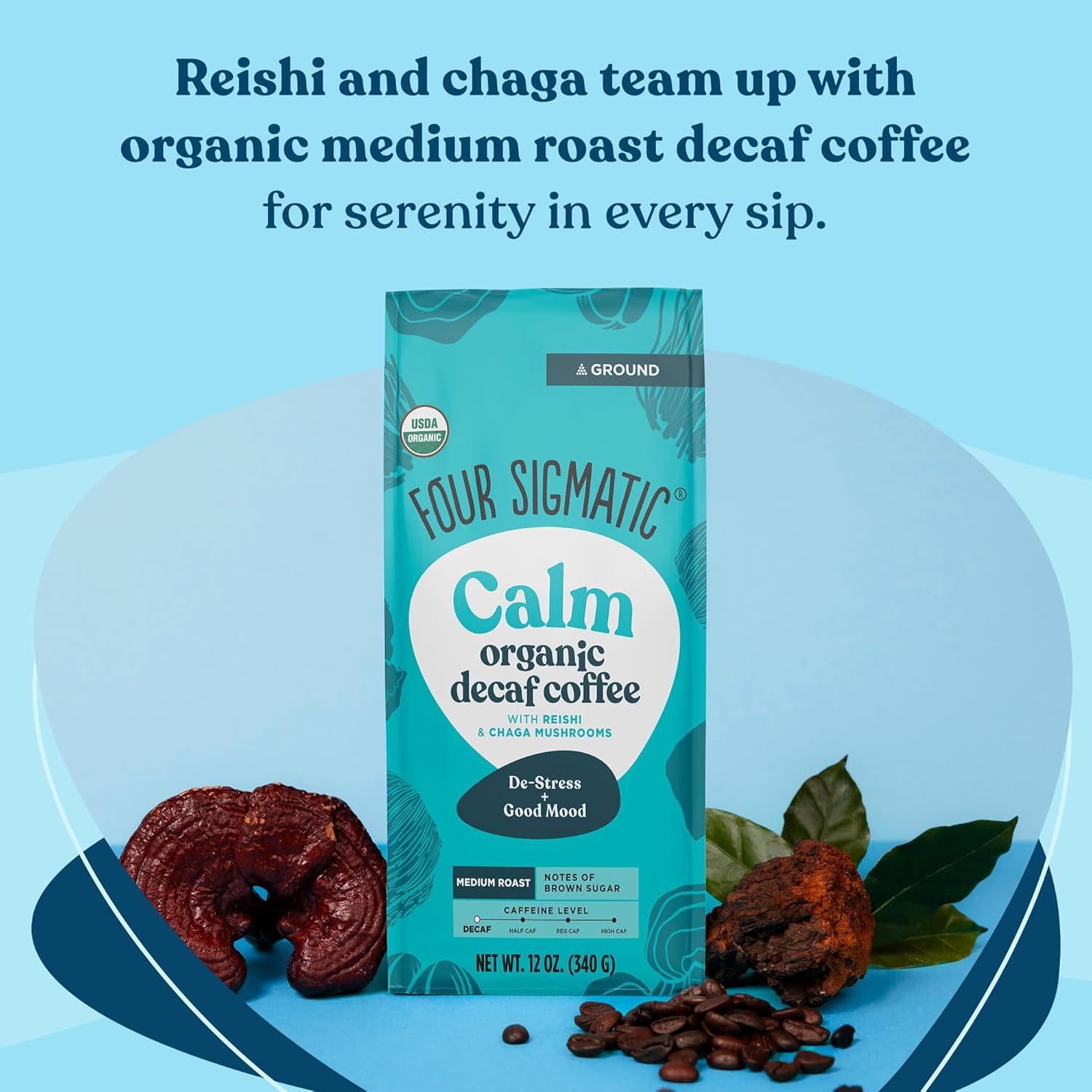 Four Sigmatic Calm Organic Decaf Ground Coffee | Swiss Water Decaf Coffee Ground | Decaffeinated Coffee With Chaga & Reishi Mushroom Extracts | Decaf Coffee For Stress Relief | 12Oz Bag