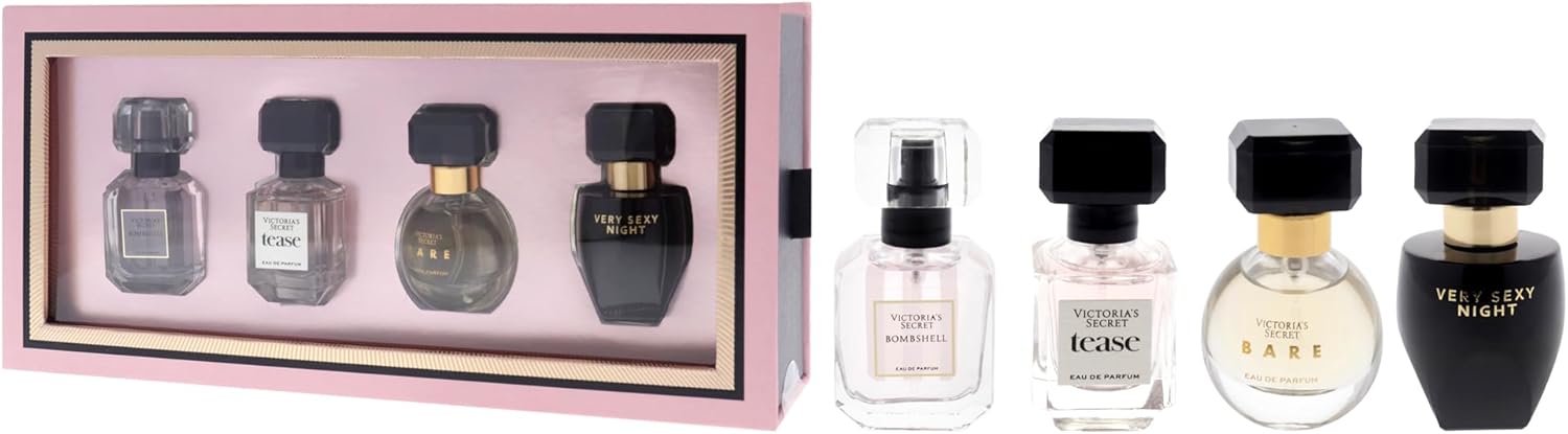 Product Description Explore a variety of scents with the Fragrance Discovery Set by Victoria's Secret. This 4 pc mini gift set includes 0.25 oz EDP sprays of Bombshell, Tease, Bare, and Very Sexy Night. Directions Spray the perfume on pulse points such as wrists, neck, and behind the ears. Do not rub the skin after application as it can affect the scent. Apply a moderate amount for a balanced fragrance. P.when('A').execute(function(A) { A.on('a:expander:toggle_description:toggle:collapse', function(data) { window.scroll(0, data.expander.$expander[0].offsetTop-100); }); }); Safety Warning For external use only. Avoid contact with eyes. Keep away from naked flame or direct heat sources. See more,Includes 4 different EDP sprays,Perfect for trying new scents,Ideal for gifting or travel