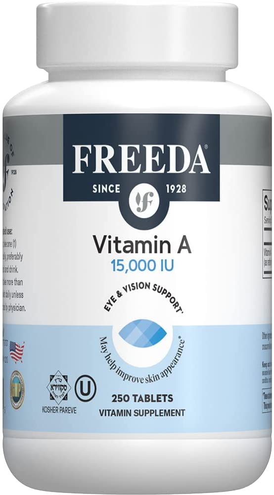 Freeda Kosher Vitamin A Palmitate tablets provide a concentrated source of vitamin A in a convenient tablet form. Each tablet contains 15,000 international units (I.U.) of vitamin A (palmitate). These kosher-certified tablets are packaged in a tightly sealed bottle to help preserve product quality.