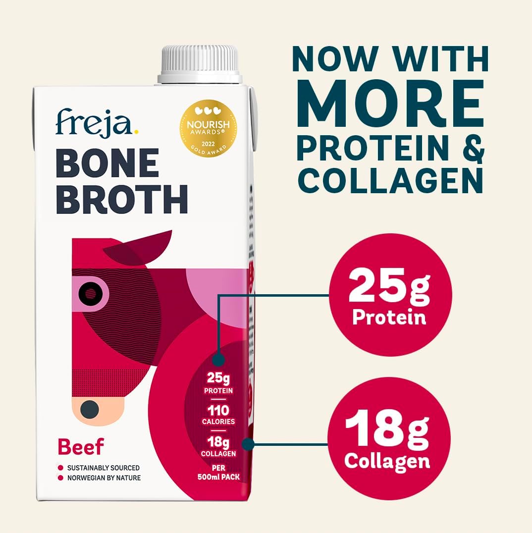 About this item WHAT IS BONE BROTH : An award winning premium broth made from meaty bones, herbs and vegetables, intensely simmered for up to 24 hours then strained to leave a clear liquid. Bone Broth is compatible with intermittent fasting, ketogenic, paleo, low-carb, dairy-free and gluten-free diets. SERIOUS ABOUT SUSTAINABILITY: Our beef is sourced for the highest environmental and welfare standards from Norwegian cooperative farmers - equivalent to British organic requirements. Grass-fed, minimal use of antibiotics, packed in fully recyclable cartons, made from 90% renewable materials. THE FOUNDATION OF FLAVOUR: Made from natural ingredients and tastes better than homemade. Best enjoyed simply warmed and sipped from a mug, or used as a hero ingredient to enhance any dish. NO NONSENSE NUTRITION: Bone Broth is a foundational health food: it’s a low calorie gut health essential, an immune system booster and a great source of protein, collagen and amino acids - a nutritional powerhouse to make you feel great. CONVENIENCE WITHOUT COMPROMISE: Freja Bone Broth is a store-cupboard essential (up to 24 month shelf life) packed in handy 500ml resealable cartons. Simmered for hours, ready in seconds! › See more product details,WHAT IS BONE BROTH : An award winning premium broth made from meaty bones, herbs and vegetables, intensely simmered for up to 24 hours then strained to leave a clear liquid. Bone Broth is compatible with intermittent fasting, ketogenic, paleo, low-carb, dairy-free and gluten-free diets,SERIOUS ABOUT SUSTAINABILITY: Our beef is sourced for the highest environmental and welfare standards from Norwegian cooperative farmers - equivalent to British organic requirements. Grass-fed, minimal use of antibiotics, packed in fully recyclable cartons, made from 90% renewable materials,THE FOUNDATION OF FLAVOUR: Made from natural ingredients and tastes better than homemade. Best enjoyed simply warmed and sipped from a mug, or used as a hero ingredient to enhance any dish,NO NONSENSE NUTRITION: Bone Broth is a foundational health food: it’s a low calorie gut health essential, an immune system booster and a great source of protein, collagen and amino acids - a nutritional powerhouse to make you feel great,CONVENIENCE WITHOUT COMPROMISE: Freja Bone Broth is a store-cupboard essential (up to 24 month shelf life) packed in handy 500ml resealable cartons. Simmered for hours, ready in seconds!