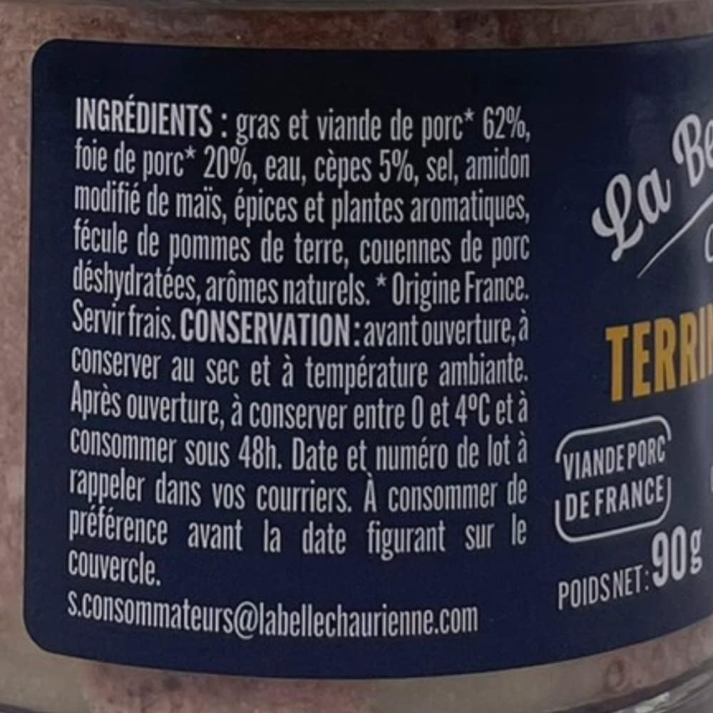 About this item Selection of four French terrines in a gift box Included is one each of the following: farmhouse terrine with cep mushrooms 90g, farmhouse terrine with Roquefort cheese 90g, marinated wild boar terrine 90g, farmhouse terrine with smoky Espelette pepper 90g Made by La Belle Chaurienne in the South West of France › See more product details,Selection of four French terrines in a gift box,Included is one each of the following: farmhouse terrine with cep mushrooms 90g, farmhouse terrine with Roquefort cheese 90g, marinated wild boar terrine 90g, farmhouse terrine with smoky Espelette pepper 90g,Made by La Belle Chaurienne in the South West of France