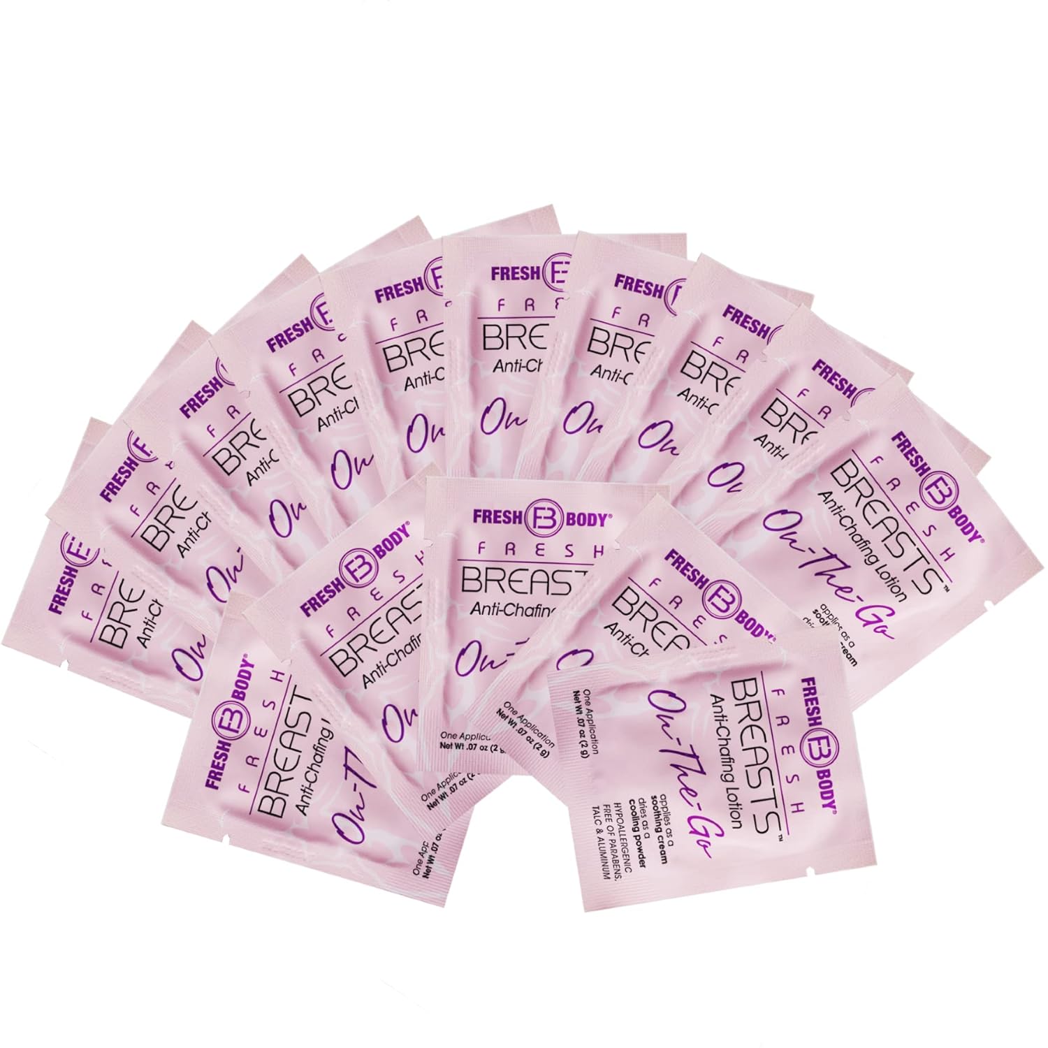 Includes: (30 count) 0.07 oz Travel Size Single Packets of Fresh Breasts On-The-Go Anti-Chafing Lotion - Soothing Deodorant Lotion for Women - Single Use Trial Size Packet | Fragrance-free, Aluminum-Free, Paraben-Free, and Talc-Free. Hypoallergenic. Not Tested on Animals Just HumansStep away from the messy powders. Fresh Breasts is the Solution for Women. Anti-chafing cream helps prevent wetness, dreaded swoob and the uncomfortable sweaty, sticky feeling caused by perspiration under boobs and other problem areas. Helps you stay fresh and dry in between showersMany women suffer from perspiration and chafing under their breasts, bra, skin folds, inner thighs and cleavage chest area, especially during the summer months. Apply a small amount to help keep the girls dry and odor-free while out in the heat and humidityApplied as a lotion that quick-dries into a silky, clump-free absorbent powder. Naturally derived product with Oatmeal as an anti-irritant. Scent-free so it won*t compete with your other products and perfumesSoothes and helps control underboob sweat whether you are hitting the gym, attending a concert, working long hours, having a hot date night, road tripping across the country, or just pushing through the daily grindFresh Body Fresh Breasts On-The-Go Anti Chafing Deodorant Lotion to Powder - Unscented, 0.07 oz Travel Size (30 Pack) Soothing Lotion for Women - No Talc, Aluminum or Fragrance