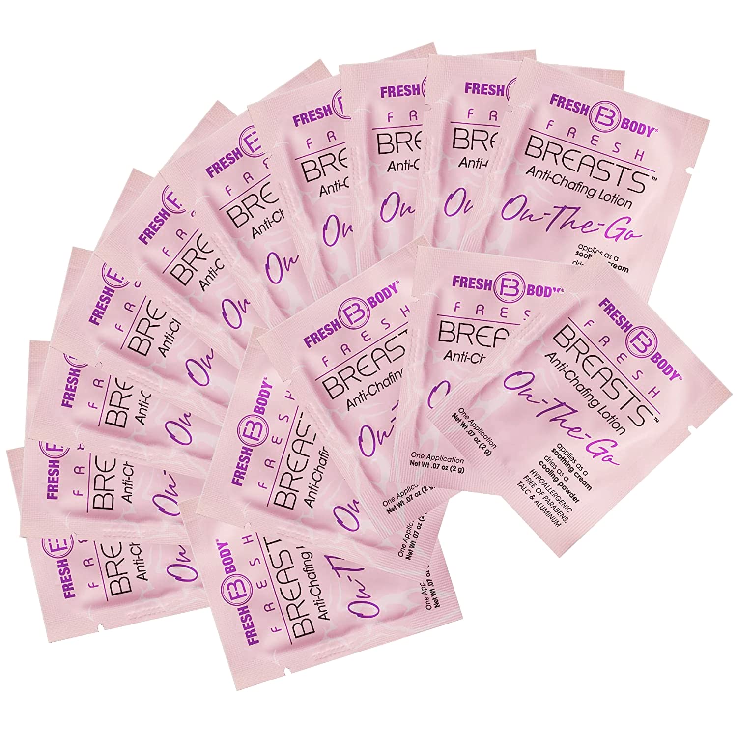 Includes: (15 count) Travel Size Single Packets of Fresh Breasts On-The-Go Anti-Chafing Lotion, 0.07oz each - Soothing Deodorant Lotion to Powder for Women - Single Use Trial Size Packet | Fragrance-free, Aluminum-Free, Paraben-Free, and Talc-Free. Hypoallergenic. Not Tested on Animals Just HumansStep away from the messy powders. Fresh Breasts is the Solution for Women. Anti-chafing cream helps prevent wetness, dreaded swoob and the uncomfortable sweaty, sticky feeling caused by perspiration under boobs and other problem areas. Helps you stay clean and fresh in between showersMany women suffer from perspiration and chafing under breasts, bra line, skin folds, inner thighs and cleavage chest area, especially during the summer months. Apply a small amount to help keep the girls dry and odor-free while out in the heat and humidityApplied as a lotion that quick-dries into a silky, clump-free absorbent powder. Naturally derived product with Oatmeal as an anti-irritant. Scent-free so it won*t compete with your other products and perfumesSoothes and helps control under boob sweat whether you are hitting the gym, attending a concert, working long hours, having a hot date night, road tripping across the country, or just pushing through the daily grindFresh Body Fresh Breasts On-The-Go Anti Chafing Deodorant Lotion to Powder - Unscented, 0.07oz Travel Size (15 pack) Anti Chafe Cream for Women, Inner Thighs & Areas that Sweat - No Talc, Aluminum
