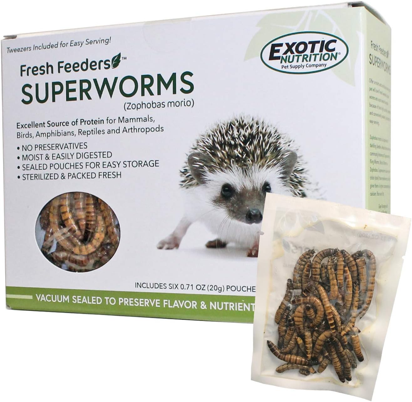 Exotic Nutrition's Fresh Feeders Superworms provide freshly packaged moist insects that are sterilized (cooked) then packaged in convenient pouches for your easy feeding. SIZE : Includes six 0.71 oz. (20 g.) pouches FEATURES : ? ALL NATURAL - Farm-raised, all-natural insects contain no preservatives and are easily digested. ? EASY STORAGE - Each box contains six individual pouches that can be re-sealed (bag clip included) for easy storage. ? INSECTIVORES - Ideal supplemental food source for Sugar Gliders, Hedgehogs, Turtles, Tropical fish, Reptiles, Amphibians, and other Insectivores. ? CONVENIENT FEEDING - Comes with feeding tweezer too! ? STAYS FRESH - Vacuum Sealed to Preserve Flavor & Nutrients FEEDING DIRECTIONS: Offer 2-4 insects per feeding depending on species, increase amount for larger animals. Adjust according to the weight of the species. Refrigerate unused portion after opening, use enclosed bag closer for storage. Tweezers included for easy, mess-free serving. STORAGE: Store unopened in a cool, dry place. Once individual packs are opened, refrigerate and use within 7 days. Use the provided bag clip to close bags and keep unused insects fresh between uses. Discard after Best Used By date printed on box. Ingredients: Farm-Raised Superworms (Zophobas morio) Guaranteed Analysis: Crude Protein 18.8% (min), Crude Fat 0.6% (min), Crude Fiber 3.2 % (max), Moisture 76.0% (max)