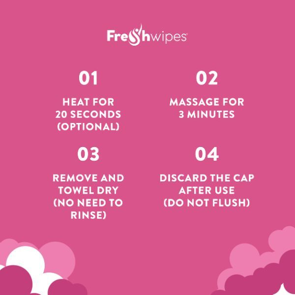 FreshWipes Rinse-Free Shampoo Cap is an ideal way to wash your hair without water. Simply place the cap on the head, tuck all the hair inside and massage for 3 minutes then thoroughly TOWEL DRY to remove residue. Our shampoo in a cap will fully cleanse and condition your hair