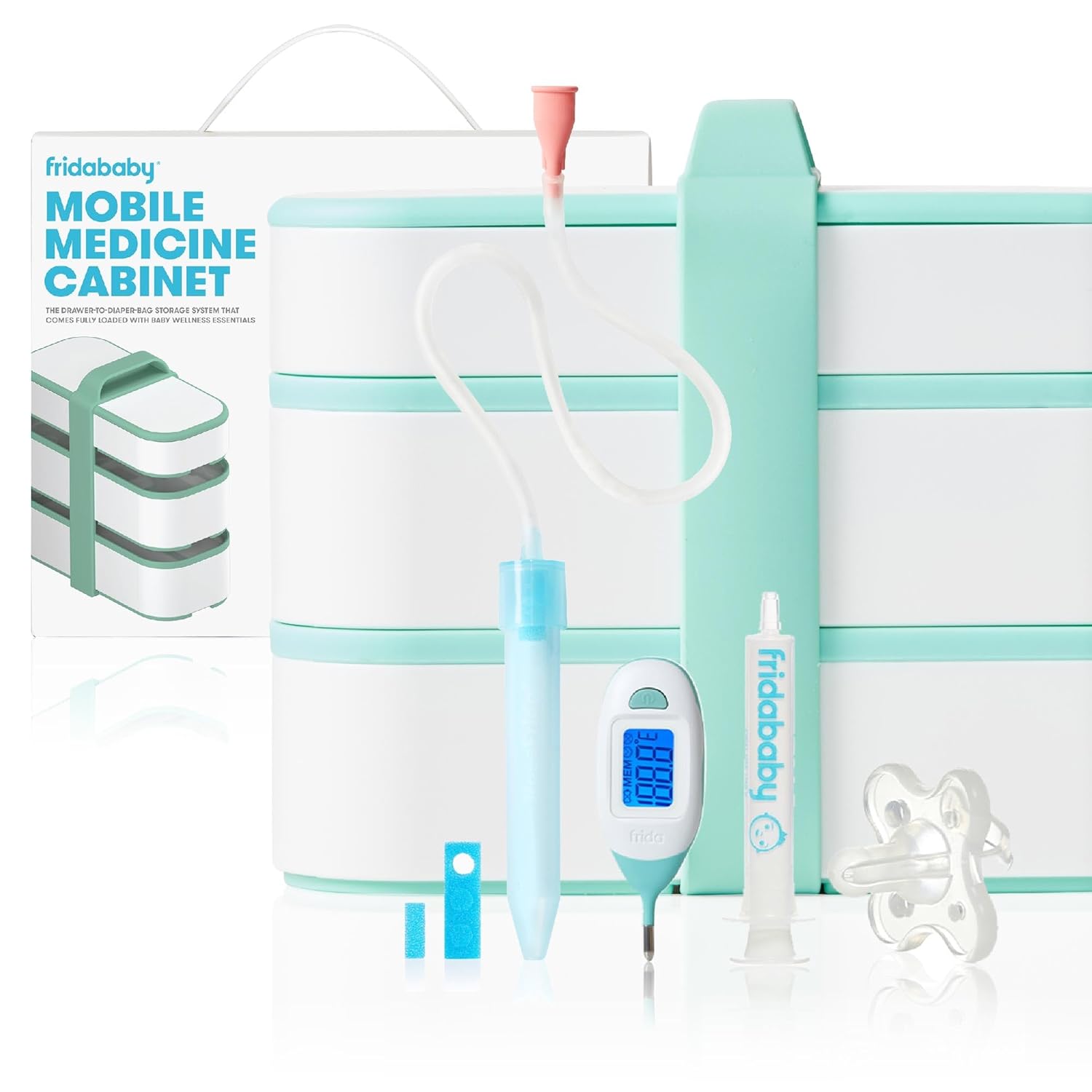 Frida Baby Mobile Medicine Cabinet Travel Kit | Baby Essentials Gift Set Includes Nosefrida Snotsucker, Rectal Thermometer, Medifrida Medicine Dispenser With Portable Carrying Case