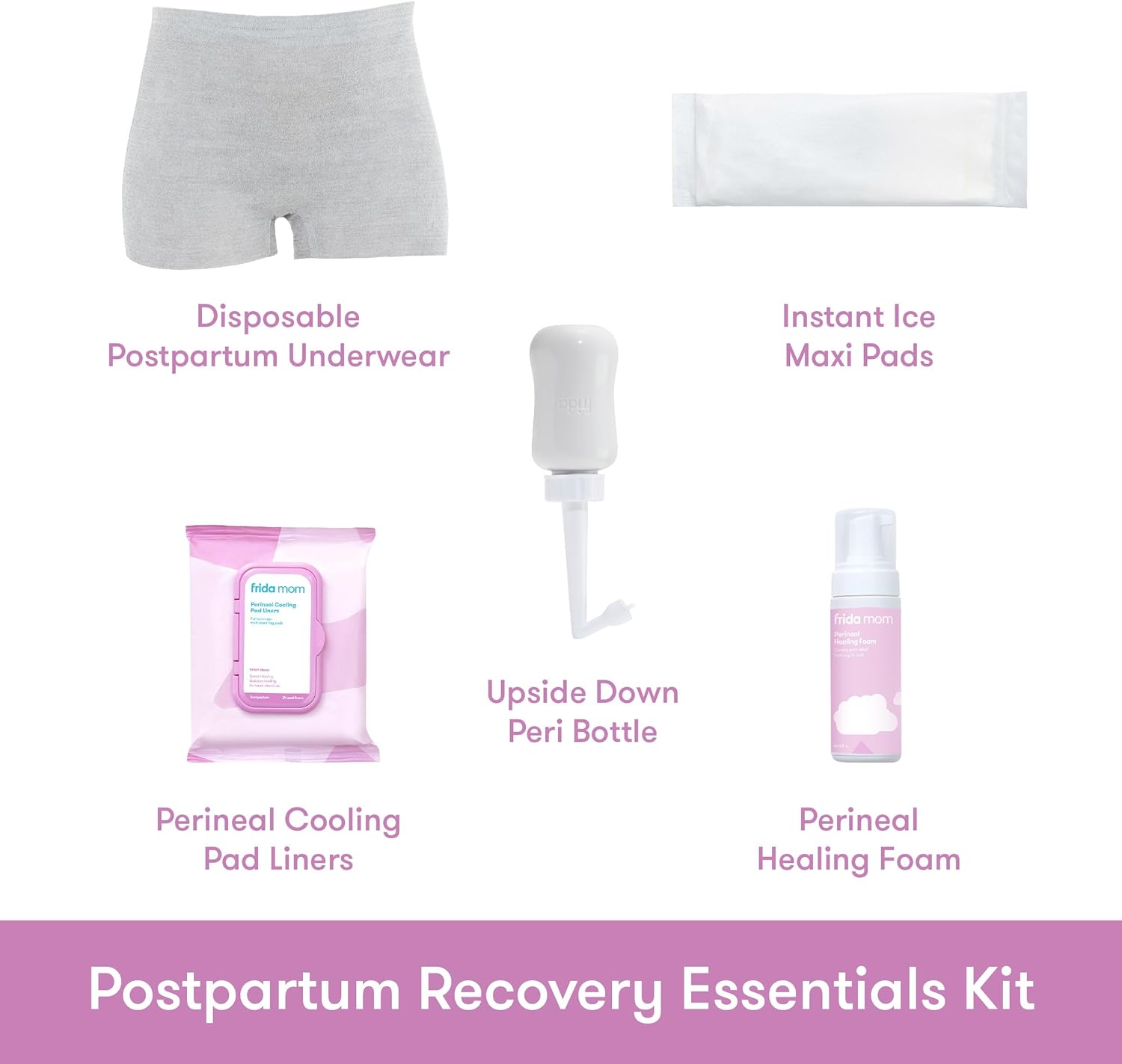 5-STEP POSTPARTUM RECOVERY REGIMEN: Layer on the relief with our 5 step Postpartum Recovery Regimen to cleanse, wear, cool and absorb, soothe and relieve pain in the perineal areaBREAST CARE SUPPORT: Breastfeeding tools for stubborn clogged ducts, let-down lags and tired, worn-out boobsNEW MOM SUPPORT SQUAD: Two kits with everything mom needs for postpartum recovery + breastfeeding strugglesREGISTRY MUST-HAVE: Perfectly packaged for registry and shower gifting for a mom-to-beWHAT'S INSIDE: Upside Down Peri Bottle (1 peri bottle) Disposable Postpartum Underwear (4 pairs) - Size Regular, Waist 28"" - 42"" Instant Ice Maxi Pads (4 pads) Perineal Cooling Pad Liners (24 witch hazel liners) Perineal Healing Foam (net 5 fl. oz.) Toilet-top storage caddy and carry case 2-in-1 Lactation Massager Instant Heat Breast Warmers (2 sets - 2 small + 2 large heat pacls) Breast Mask for Lactation (2 sheets) Breast Mask for Hydration (2 sheets)The aim of is to offer many high quality products to customers and satisfy the needs of all customers. To achieve this, will spend more time to design the products