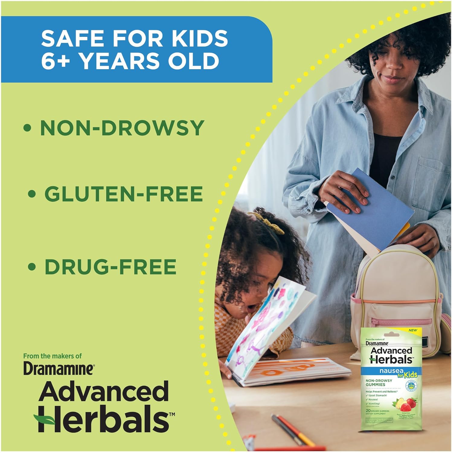 About this item From the makers of Dramamine, Advanced Herbals Nausea Ginger Chews is a dietary supplement that helps provide nausea relief from morning sickness, motion sickness, upset stomach* and occasional heartburn The only ginger chews with a clinically tested dose of ginger (extract equivalent to clinically tested dose of powdered ginger for morning and motion sickness) Advanced Herbals Ginger Chews may provide non-medicated relief from GLP-1 related nausea, consult your doctor Delicious lemon-honey-ginger flavor in convenient individually-wrapped soft chews Get non-drowsy nausea relief by taking 2 ginger chews as needed › See more product details,From the makers of Dramamine, Advanced Herbals Nausea Ginger Chews is a dietary supplement that helps provide nausea relief from morning sickness, motion sickness, upset stomach* and occasional heartburn,The only ginger chews with a clinically tested dose of ginger (extract equivalent to clinically tested dose of powdered ginger for morning and motion sickness),Advanced Herbals Ginger Chews may provide non-medicated relief from GLP-1 related nausea, consult your doctor,Delicious lemon-honey-ginger flavor in convenient individually-wrapped soft chews,Get non-drowsy nausea relief by taking 2 ginger chews as needed
