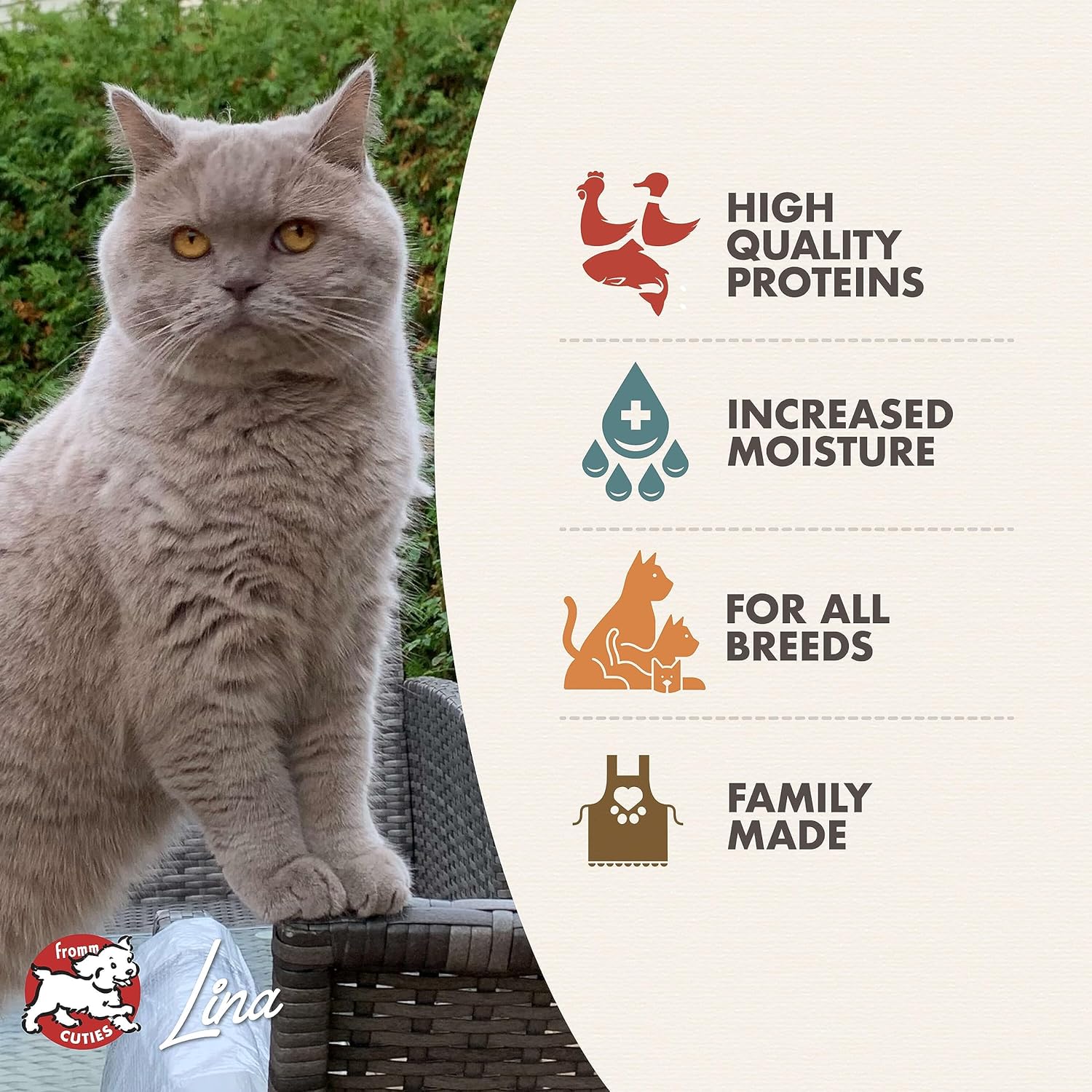 HIGH-QUALITY PROTEIN - Our canned cat food contains chicken, duck, and salmon. Very digestible and highly palatable proteins that provide amino acids required for maintaining muscle, tissue repair, hormone synthesis, and other metabolic processes