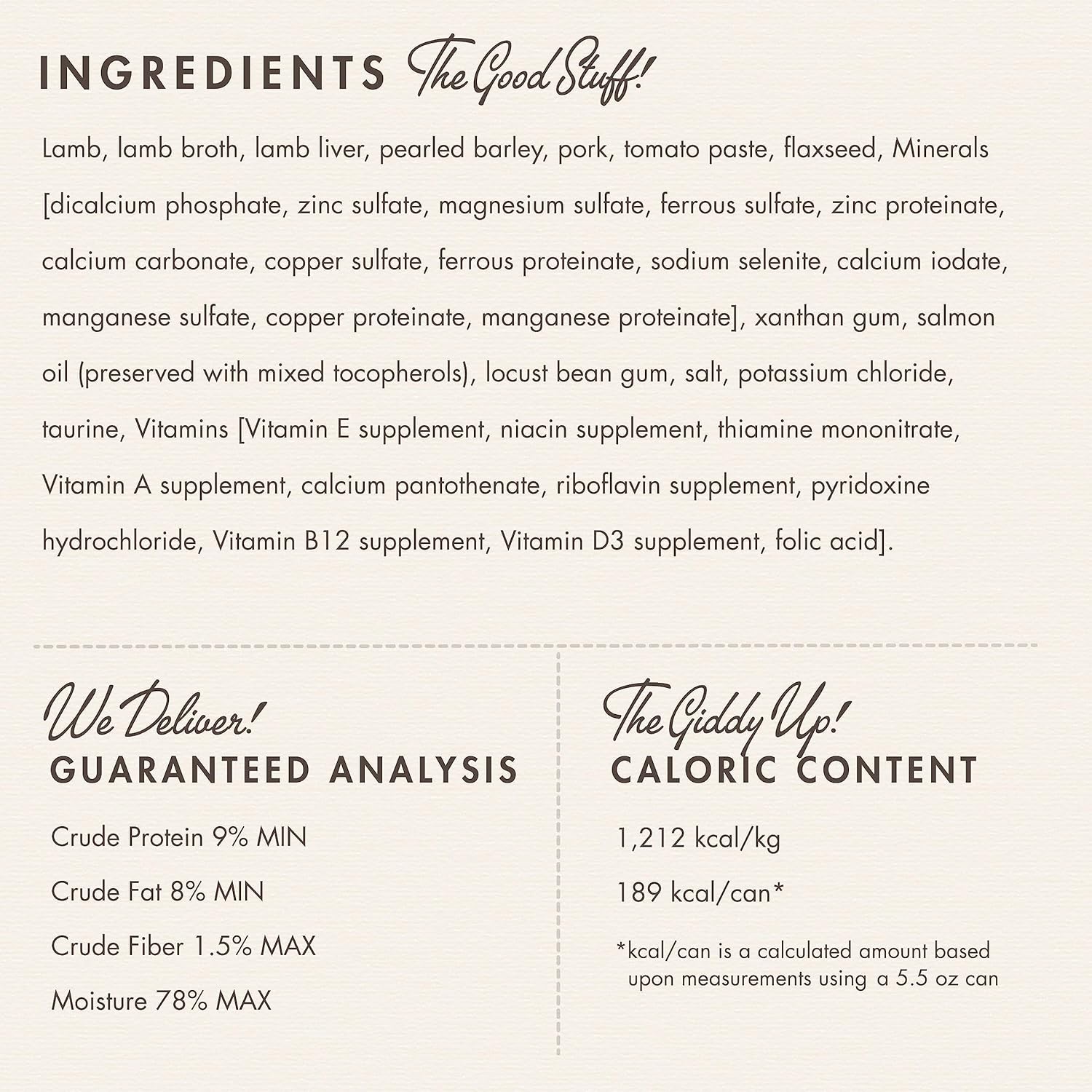 WET CAT FOOD - This case contains twelve 5.5 oz cans. Each can contains finely minced lamb cooked in broth. Our complete and balanced recipe is free from artificial colors, flavors, or preservatives. Pate provides a unique texture