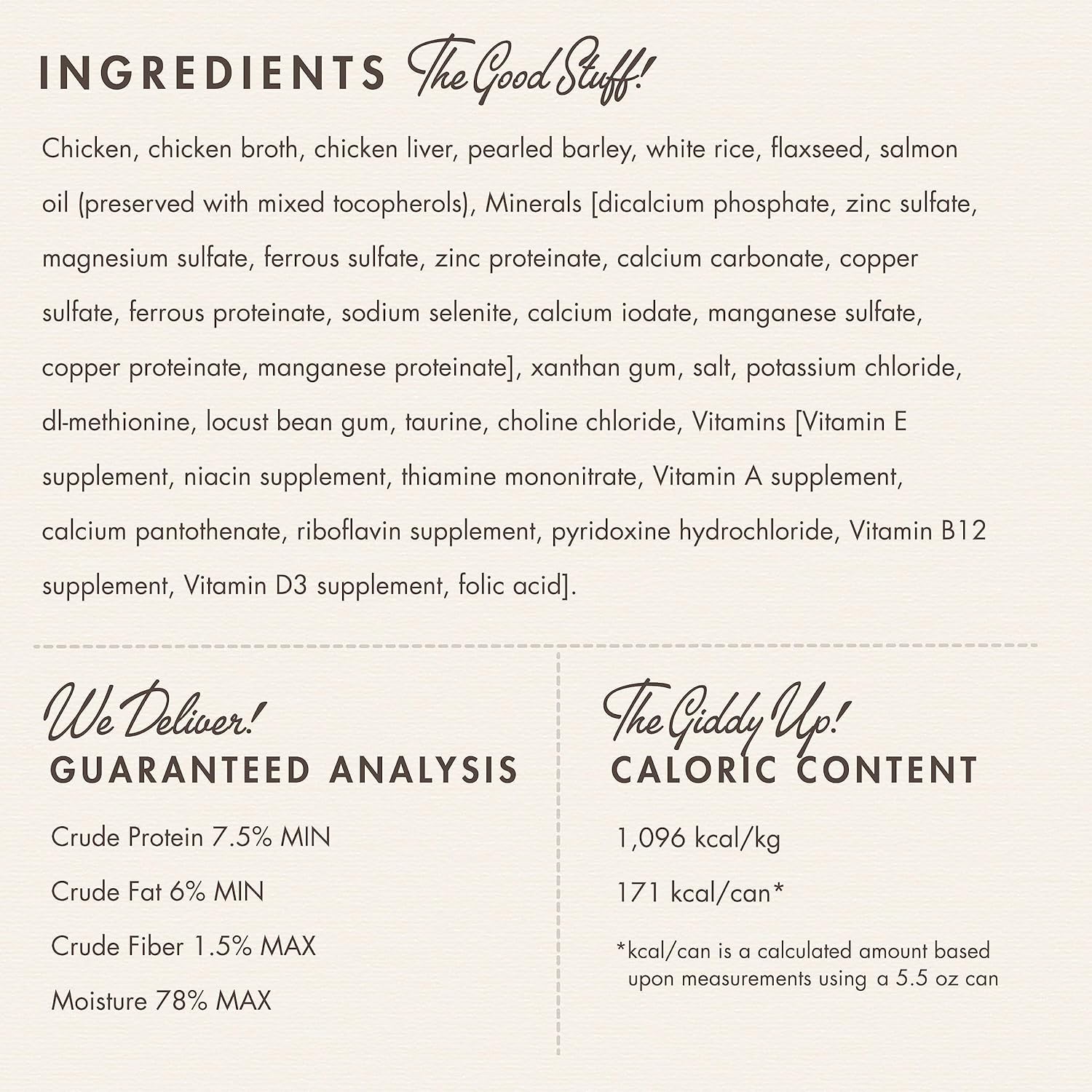 WET CAT FOOD - This case contains twelve 5.5 oz cans. Each can contains finely minced chicken and rice cooked in chicken broth. Our balanced recipe is free from artificial colors, flavors, or preservatives. Pate provides a unique texture