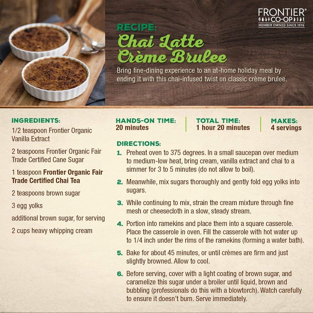 Frontier Co-Op Organic Fair Trade Certified Chai Tea Is A Comforting Flavored Tea Blend That Offers A Robust Combination Of Black Tea And Spices. Traditional Chai Is A Strong Black Tea Infused With Aromatic Indian Spices, Including Black Pepper, Cinnamon, Cardamom, And Others. This Is A Tea With Layers Of Complex And Delicious Flavors. Best Uses: Enjoy This Tea By Itself, Or Use It To Make Yourself A Chai Latte. This Chai Tea Is Also An Excellent Ingredient In Desserts And Diy Cosmetics And Soaps. Features 1 Pound Bulk Bag (16 Ounces) Certified Organic Fair Trade Certified; Kosher Certified And Non-Irradiated A Mixture Of Aromatic Spices; Contains Caffeine Popular Worldwide Alternative Names: Spiced Tea
