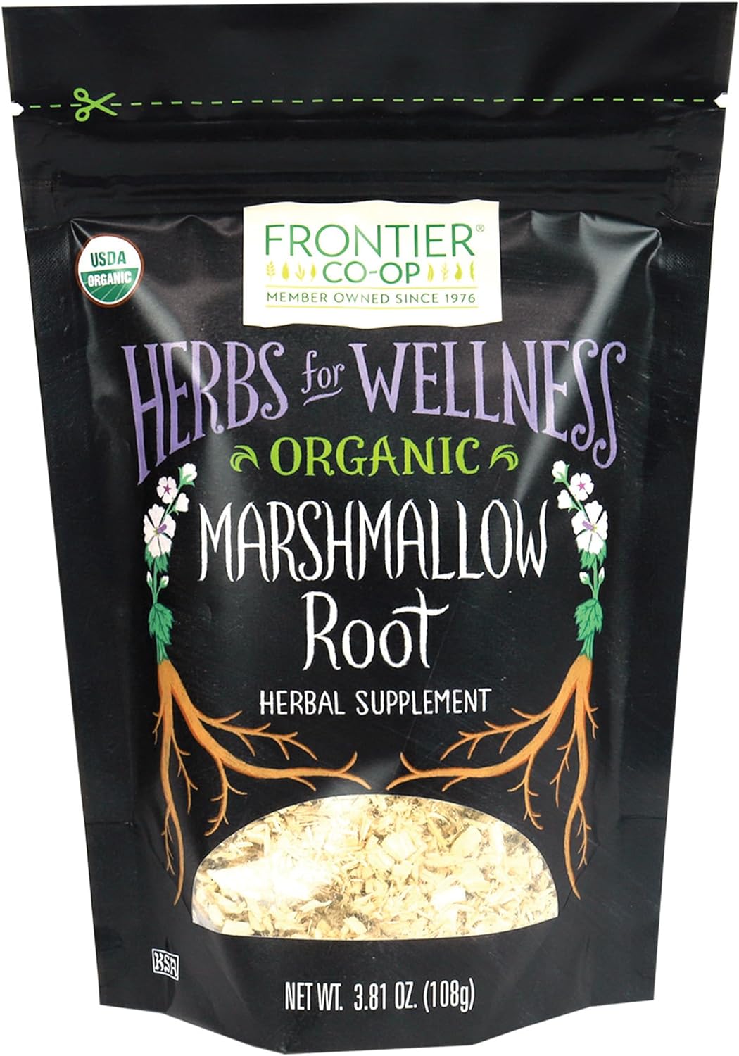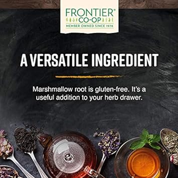 MARSHMALLOW ROOT - Frontier Co-op Marshmallow Root (Althea officinalis) is a key ingredient in many syrups, teas, ointments, lozenges and many other marshmallow root herb recipes. It is derived from the root of the marshmallow plant. There are no artificial additives or chemicals used at any step of the growing process10A VERSATILE INGREDIENT - Marshmallow root is gluten-free, and a useful addition to your herb drawer. Besides serving as a distinctly flavored ingredient in beverages, it’s also used in skincare products, and creative recipe ideas such as marshmallow organic syrups and more10PERFECT AS WELLNESS TEA - This high-quality marshmallow root is popular in household wellness recipes because of its sweet taste and starchy aroma. Marshmallow root is also used as traditional soothing support for the digestive system10ORGANICALLY GROWN IN BULGARIA - Frontier Co-op Organic Marshmallow Root is harvested in Bulgaria. This product is organic, kosher and non-irradiated10ABOUT US - Owned by stores and organizations that buy and sell our products, Frontier Co-op has been a member-owned cooperative since 1976. We support natural living and our products are never irradiated or treated with ETO (Ethylene oxide). We're committed to the health and welfare of the environment and everyone producing and consuming our botanical products10Frontier Co-op Marshmallow Root is a high-quality ingredient processed from the root of the marshmallow plant. It is commonly used in teas, poultices, syrups, ointments, lozenges and other products due to its sweetness and fragrance. Best Uses: Add to poultices, syrups, ointments, lozenges or wellness teas. This Pack Includes: - 3.81 ounces total - High-quality organic roots ideal for wellness tea - Suggested Uses: Teas and syrups - Botanical name: Althea officinalis Add marshmellow root to your herb cabinet, or give as a unique Christmas/holiday gift or stocking stuffer for the creative bakers, chefs and holistics enthusiasts in your life. Make anything from marshmallow root supplement capsules to marshmellow root tea, marshmallow root tea bags, marshmallow leaf treats, marshmallow root for dogs' healthy treats and so much more10