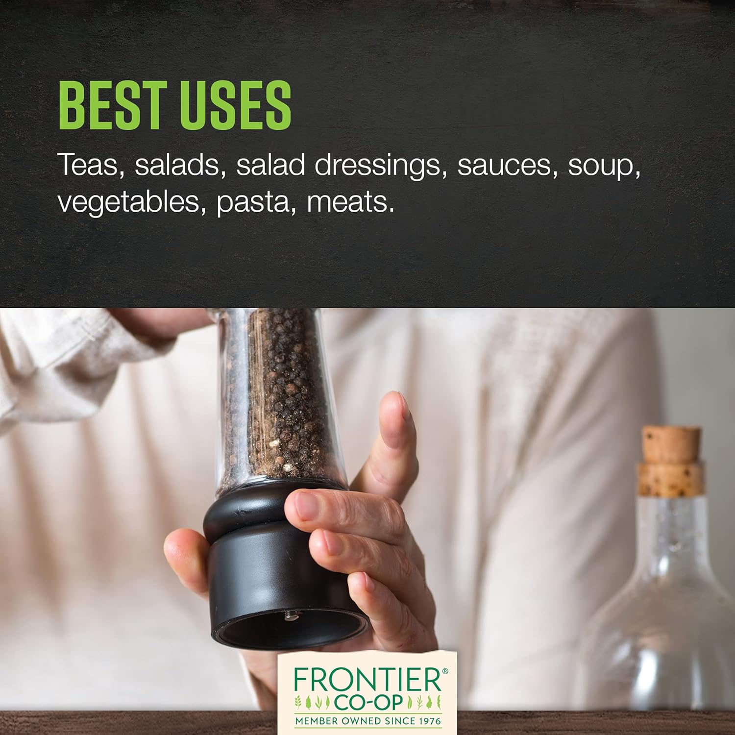 TELLICHERRY BLACK PEPPERCORNS: Frontier Co-op offers the finest TGSEB-grade peppercorns. Renowned for their size and origin from India's Malabar Coast, they enhance your dishes with superior flavor