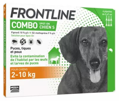 Frontline Combo Dog Size S (2-10Kg) 6 Pipettes Ensures A Continuous Protection Against Lice, Chips And Ticks Thanks To A Double Action At The Same Time On Adults And Immature Forms. It Eliminates The Chips, The Ticks And The Crushing Lice On Your Animal And Protects It From The Infections (8 Weeks For The Chips, 4 Weeks For The Ticks, 6 Weeks For The Lice). Frontline Combo Dog Size S (2-10Kg) 6 Pipettes Is Designed For 2-10Kg Dogs