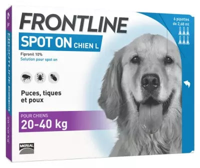 Frontline Spot-On Dog Size L (20-40Kg) 6 Pipettes Eliminates The Chips, The Ticks And The Crushing Lice On Your Animal And Protects It From The Infections (2 Months For The Chips, 1 Month For The Ticks). Frontline Spot-On Dog Size L (20-40Kg) 6 Pipettes Is Designed For 20-40Kg Dogs
