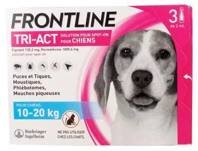 Frontline Tri-Act Dogs 10-20Kg 3 Pipettes Is A Solution For Spot On For An External Use Only, For Dogs Between 10 To 20 Kgs. These Pipettes Combine Fipronil And Permethrine For Treatment And Prevention: Infestations By Fleas And/Or Ticks, When Repellent (Anti-Feeding) Activity Is Needed Against Sandflies, Biting Flies, Mosquitoes. This Solution Reduces The Risk Of Infection By Leishmania Infantum. Do Not Use For Cat And Rabbits