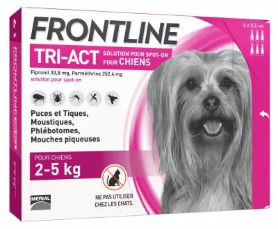 Frontline Tri-Act Dogs 2-5Kg 6 Pipettes Is A Solution For Spot On For An External Use Only, For Dogs Between 2 And 5 Kg. These Pipettes Combine Fipronil And Permethrine For A Large Specter Action To Remove: - Fleas And Ticks, - Biting Flies, - Sand-Flies, - Mosquitoes. Do Not Use On Cats And Rabbits
