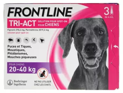 Frontline Tri-Act Dogs 20-40Kg 3 Pipettes Is A Solution For Spot-On For An External Use Only, For Dogs Between 20 To 40 Kg, For The Treatment And Prevention Of Infestations By Fleas And/Or Ticks, When Repellent (Anti-Feeding) Activity Is Required Against Sandflies, Biting And Mosquitoes. It Is Also Used For Reducing The Risk Of Leishmania Infantum Infection