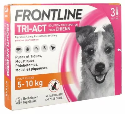 Frontline Tri-Act Dogs 5-10Kg 3 Pipettes Is A Solution For Spot On For An External Use Only, For Dogs Between 5 And 10 Kg. This Product Allows The Treatment And Prevention Of Infestations By Fleas And/Or Ticks, When A Repellent Activity (Anti-Feeding) Is Necessary Against Sandflies, Biting Flies And Mosquitoes. It Allows Thus To Reduce Infection Risk To Leishmania Infantum