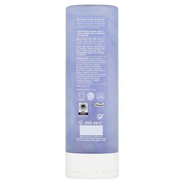 Product Information:Step into the shower and indulge yourself in this sweet lavender and vanilla scent to help you feel clean and fresh for the day ahead,Features:- With Natural Lavender Extract. - With An Added Skin Conditioner. - Ph Balanced,Warning or Restrictions:Do not Swallow. Avoid contact with eyes. If contact occurs, rinse immediately. Keep out of reach of children,Product Specification:Aqua, Sodium Laureth Sulfate, Sodium Chloride, Cocamidopropyl Betaine, Glycerin, Parfum, Citric Acid, Sodium Benzoate, Glycol Distearate, Potassium Sorbate, Laureth-4, Butyl Methoxydibenzoylmethane, Linalyl Acetate, Linalool, Tetrasodium Glutamate Diacetate, Lavandula Angustifolia Flower Extract, Sodium Hydroxide, Hexylene Glycol, CI 42090, CI 17200, CI 16035,Product Uses:Apply to wet skin, massage into a smooth, creamy lather and rinse clean,Recyclable:CAP ON Recycle