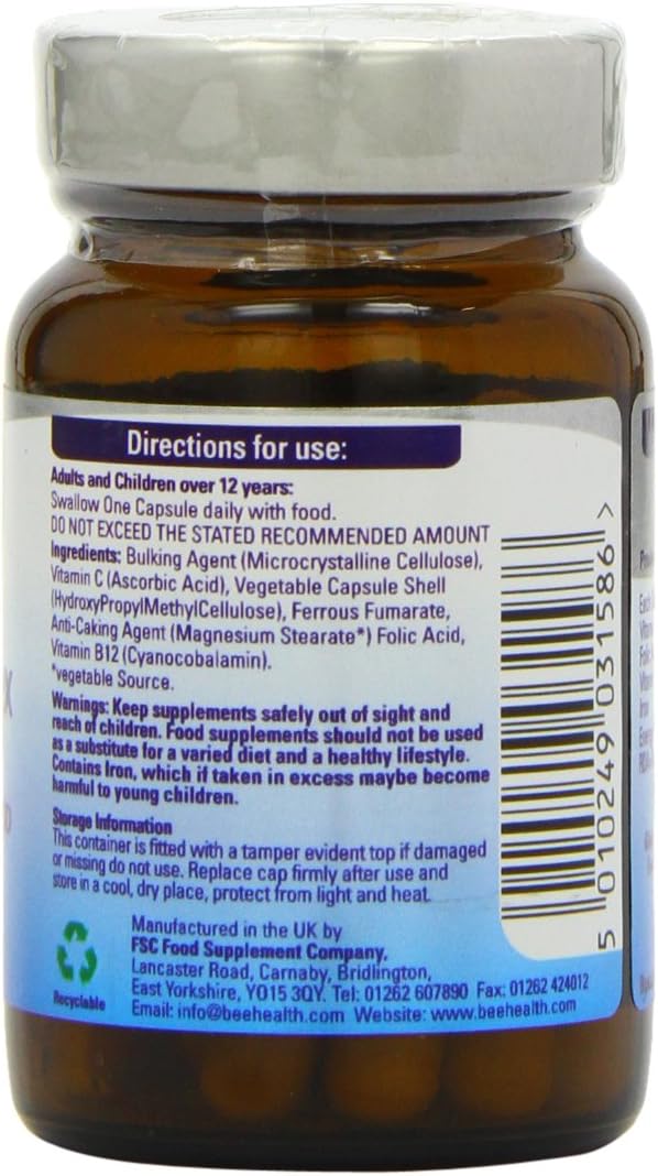 DESCRIPTION : Product Description FSC 14mg iron complex 30 capsules contains iron with vitamin C, folic acid and vitamin B12. Iron is a vital mineral carrying oxygen to cells for optimum energy production. Vitamin B12 and folic acid help to form new red blood cells. It used more likely in pregnancy, women with heavy menstruation. Suitable for vegans. Ingredients Vitamin C, iron ascorbate, iron malate, bulking agent: cellulose powder; vegetable capsule shell (hydroxypropylmethyl cellulose), anti caking agent: magnesium stearate (vegetable source); folic acid, vitamin B 12. Directions One capsule per day with a meal. Safety Warning Do not self diagnose iron deficiency. Seek medical advice before taking iron supplements. This product contains iron which, if taken in excess can be harmful to very young children. Keep out of sight and reach. Box Contains 1 x FSC 14mg Iron Complex 30 Capsules