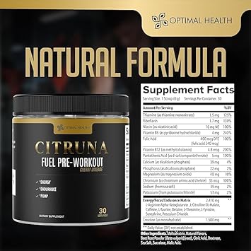 About this item FUEL YOUR WORKOUT: Elevate your workout with Citruna Fuel Preworkout Mix, expertly crafted to provide the energy and nutrients you need to conquer your exercise goals. Designed to fuel your active lifestyle, Citruna Fuel Pre Workout Mix delivers the support essential for peak performance and endurance. Whether you're powering through a tough session or aiming to surpass your personal best, Citruna Fuel ensures you're ready to take on any challenge. ENERGY-BOOSTING VITAMINS: Our expertly crafted blend of B-complex vitamins lays a powerful foundation for converting carbohydrates into fuel, providing you with sustained energy throughout your day. Key B-vitamins such as thiamine, riboflavin, and niacin work in harmony to metabolize fats and proteins, ensuring that your body efficiently utilizes the nutrients from your food for maximum energy output. FOCUS MATRIX: This powerful energy supplement is formulated with a thoughtfully selected matrix of amino acids, vitamins, and natural stimulants like caffeine to boost energy levels, enhance circulation, and sharpen mental focus. Key ingredients such as L-Citrulline, L-Arginine, and Vitamin B12 are included to ensure you get the most out of every workout and maintain optimal cognitive performance. EVERYDAY BENEFITS: Whether you're lifting weights at the gym or taking a stroll through the city, Citruna Fuel delivers the energy, endurance, and focus you need whenever you need a boost. It helps support muscle strength, enhances circulation, and increases overall stamina, making it your go-to supplement for everyday activities. MADE IN THE USA: All Citruna supplements are formulated right here in the USA, where we work closely with our manufacturers to ensure every product is safe and effective. At Optimal Health, we take pride in our transparency and commitment to providing high-quality, affordable supplements you can trust. See more product details,FUEL YOUR WORKOUT: Elevate your workout with Citruna Fuel Preworkout Mix, expertly crafted to provide the energy and nutrients you need to conquer your exercise goals. Designed to fuel your active lifestyle, Citruna Fuel Pre Workout Mix delivers the support essential for peak performance and endurance. Whether you're powering through a tough session or aiming to surpass your personal best, Citruna Fuel ensures you're ready to take on any challenge,ENERGY-BOOSTING VITAMINS: Our expertly crafted blend of B-complex vitamins lays a powerful foundation for converting carbohydrates into fuel, providing you with sustained energy throughout your day. Key B-vitamins such as thiamine, riboflavin, and niacin work in harmony to metabolize fats and proteins, ensuring that your body efficiently utilizes the nutrients from your food for maximum energy output,FOCUS MATRIX: This powerful energy supplement is formulated with a thoughtfully selected matrix of amino acids, vitamins, and natural stimulants like caffeine to boost energy levels, enhance circulation, and sharpen mental focus. Key ingredients such as L-Citrulline, L-Arginine, and Vitamin B12 are included to ensure you get the most out of every workout and maintain optimal cognitive performance,EVERYDAY BENEFITS: Whether you're lifting weights at the gym or taking a stroll through the city, Citruna Fuel delivers the energy, endurance, and focus you need whenever you need a boost. It helps support muscle strength, enhances circulation, and increases overall stamina, making it your go-to supplement for everyday activities,MADE IN THE USA: All Citruna supplements are formulated right here in the USA, where we work closely with our manufacturers to ensure every product is safe and effective. At Optimal Health, we take pride in our transparency and commitment to providing high-quality, affordable supplements you can trust