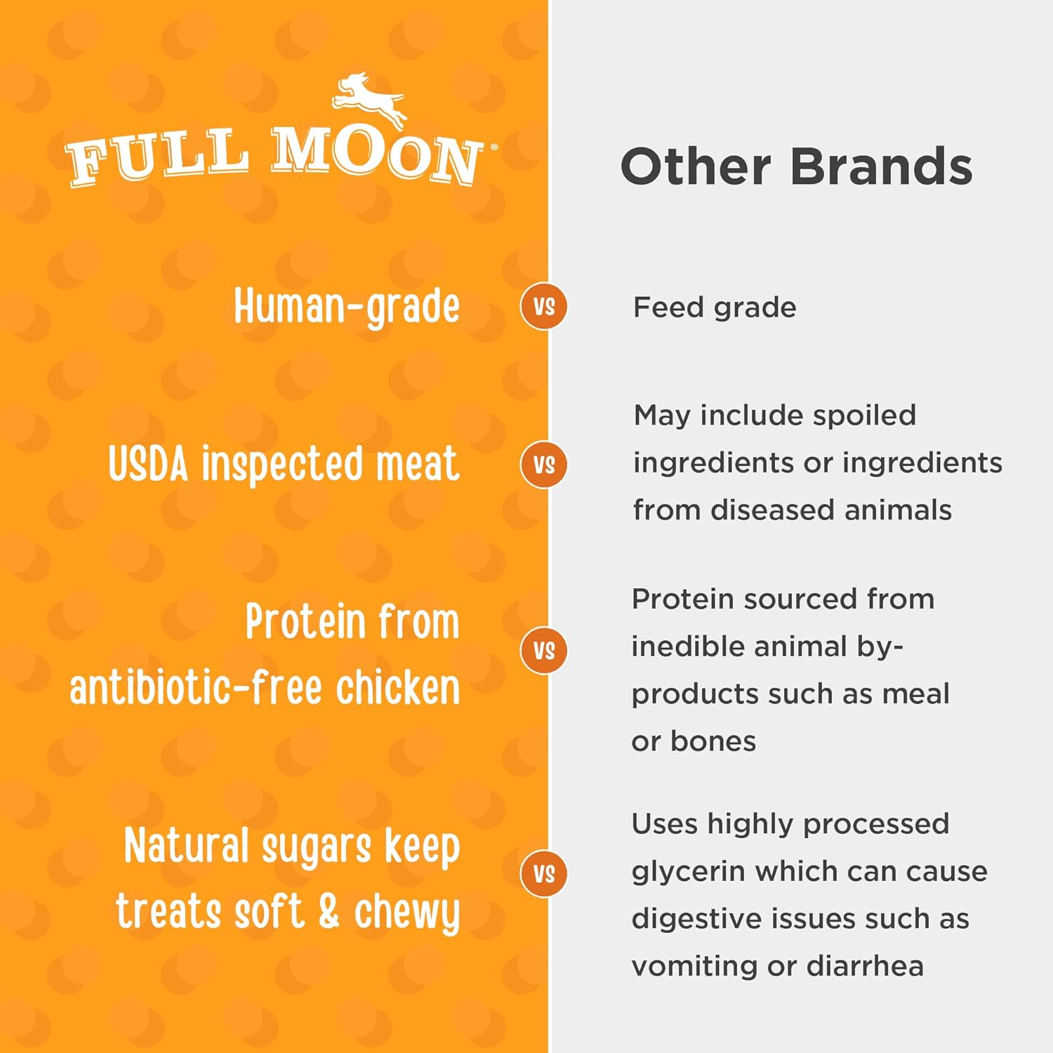 We Believe Dogs Deserve Food That Is Just As Good (Dare We Say Better) As Our Own. This Commitment Drives Our Choices, From How We Raise Our Animals, To The Ingredients We Choose, To The Kitchens We Use. YouâLl Notice The Difference The Second You Open A Bag Of Our Natural Dog Treats. Our Full Moon Treats Are Made With Love In The Usa. We Work Exclusively With The Trusted Family Farmers And Ranchers WeâVe Been In Business With For Years, Ensuring That Animals Are Raised To The Highest Ethical Standards. Every Bite Begins With Usda-Approved, Human-Grade Meatâ Cooked In Gleaming Kitchens Using Only 100% Natural IngredientsâAnd Ends With A Satisfied Pup. Each Of Our Healthy Snacks, Like Full Moon Essential Chicken Bites, Are Free Of Artificial Preservatives, Colors, Or Flavors And Full Of Things Dogs Love. Glycerin And Fillers Like Corn, Wheat, And Soy Have No Place In Our Recipes. In Other Words, We Only Use Simple, Natural Ingredients YouâD Find In A Grocery Store And Likely Eat Yourself, Like Real Chicken Breast, Rosemary, And Cassava Root. Unlike Most Pet Food, We Slow Cook Our Treats In Small Batches Using Time Honored Techniques Like Smoking And Roasting To Retain More Of The FoodâS Nutritional Value And Flavor. It Results In A Far Better Product That We Think Your Pup Will Appreciate. And If YouâRe Lucky, TheyâLl Share