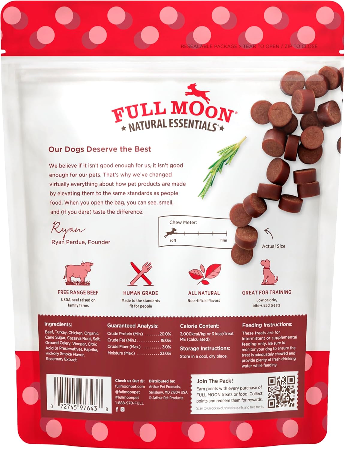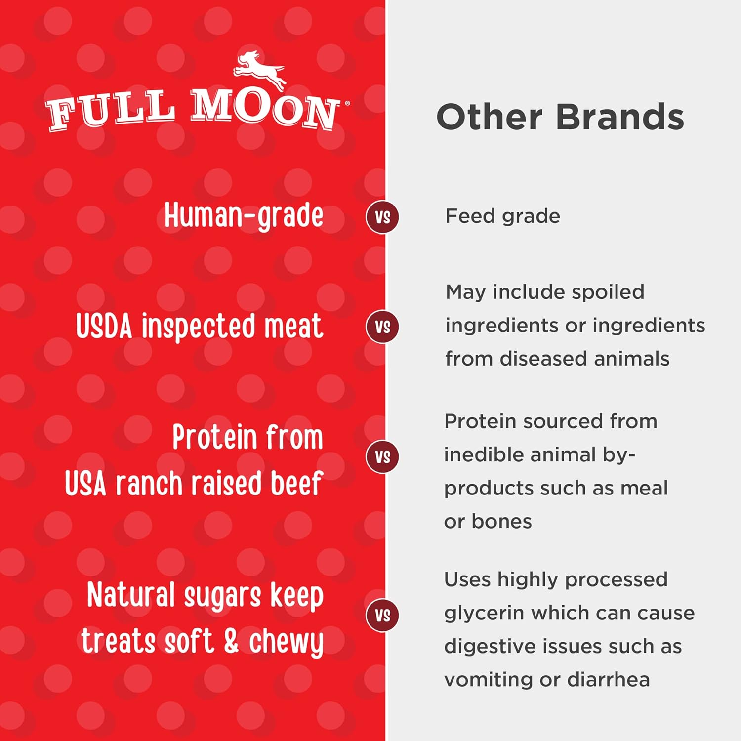 We Believe Dogs Deserve Food That Is Just As Good (Dare We Say Better) As Our Own. This Commitment Drives Our Choices, From How We Raise Our Animals, To The Ingredients We Choose, To The Kitchens We Use. YouâLl Notice The Difference The Second You Open A Bag Of Our Natural Dog Treats. Our Full Moon Treats Are Made With Love In The Usa. We Work Exclusively With The Trusted Family Farmers And Ranchers WeâVe Been In Business With For Years, Ensuring That Animals Are Raised To The Highest Ethical Standards. Every Bite Begins With Usda-Approved, Human-Grade Meatâ Cooked In Gleaming Kitchens Using Only 100% Natural IngredientsâAnd Ends With A Satisfied Pup. Each Of Our Healthy Snacks, Like Full Moon Essential Beef Bites, Are Free Of Artificial Preservatives, Colors, Or Flavors And Full Of Things Dogs Love. Glycerin And Fillers Like Corn, Wheat, And Soy Have No Place In Our Recipes. In Other Words, We Only Use Simple, Natural Ingredients YouâD Find In A Grocery Store And Likely Eat Yourself, Like Free Range Beef, Cassava Root, And Rosemary. Unlike Most Pet Food, We Slow Cook Our Treats In Small Batches Using Time Honored Techniques Like Smoking And Roasting To Retain More Of The FoodâS Nutritional Value And Flavor. It Results In A Far Better Product That We Think Your Pup Will Appreciate. And If YouâRe Lucky, TheyâLl Share!