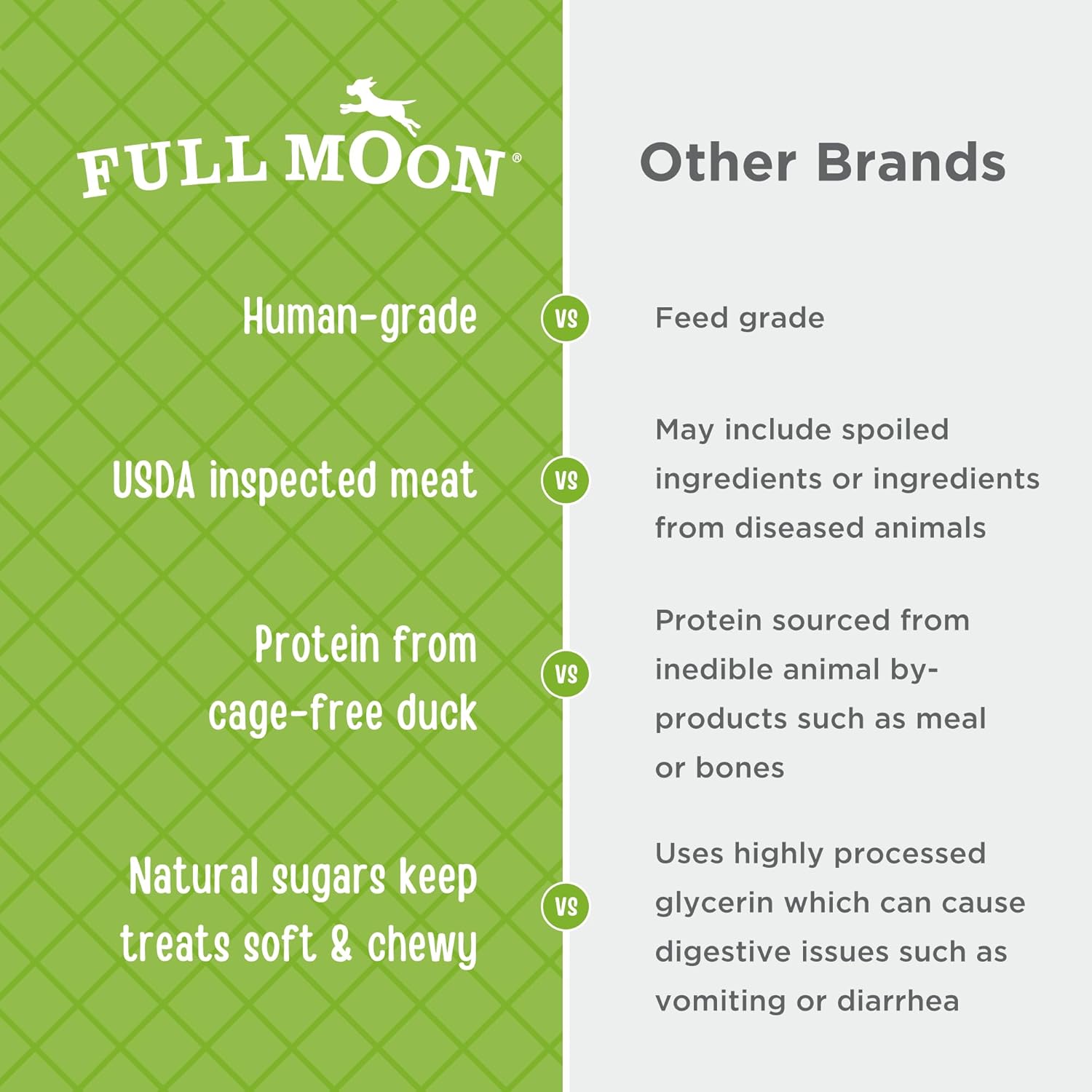 We Believe Dogs Deserve Food That Is Just As Good (Dare We Say Better) As Our Own. This Commitment Drives Our Choices, From How We Raise Our Animals, To The Ingredients We Choose, To The Kitchens We Use. YouâLl Notice The Difference The Second You Open A Bag Of Our Natural Dog Treats. Our Full Moon Treats Are Made With Love In The Usa. We Work Exclusively With The Trusted Family Farmers And Ranchers WeâVe Been In Business With For Years, Ensuring That Animals Are Raised To The Highest Ethical Standards. Every Bite Begins With Usda-Approved, Human-Grade Meatâ Cooked In Gleaming Kitchens Using Only 100% Natural IngredientsâAnd Ends With A Satisfied Pup. Each Of Our Healthy Snacks, Like Full Moon Essential Duck Tenders, Are Free Of Artificial Preservatives, Colors, Or Flavors And Full Of Things Dogs Love. Glycerin And Fillers Like Corn, Wheat, And Soy Have No Place In Our Recipes. In Other Words, We Only Use Simple, Natural Ingredients YouâD Find In A Grocery Store And Likely Eat Yourself, Like Cage Free Duck, Cassava Root, And Rosemary. Unlike Most Pet Food, We Slow Cook Our Treats In Small Batches Using Time Honored Techniques Like Smoking And Roasting To Retain More Of The FoodâS Nutritional Value And Flavor. It Results In A Far Better Product That We Think Your Pup Will Appreciate. And If YouâRe Lucky, TheyâLl Share!
