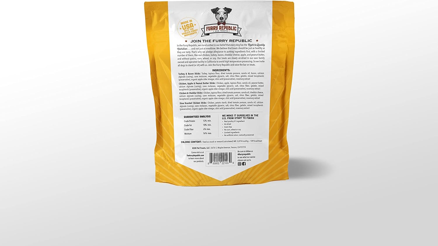 Furry Republic Meat Sticks are completely free from by-products, grains, fillers, meals, corn, wheat and soy. They are crafted with a special air-drying process at low temperatures to help lock in nutrients, proteins and vitamins for the nutrition and taste dogs need and love. Serves as the paw-fect training reward, snack or any time treat