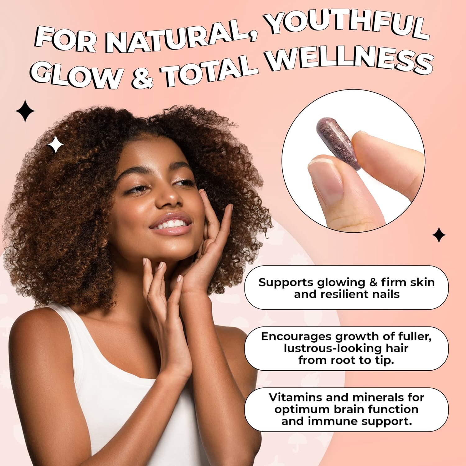 Helps Maintain Glowing Skin: Our vegan collagen powder is infused with these essential proteins: L-Glycine, L-Lysine, and L-Proline. Taking 2 vegan collagen pills daily can help enhance skin elasticity, retaining your natural youthful glow