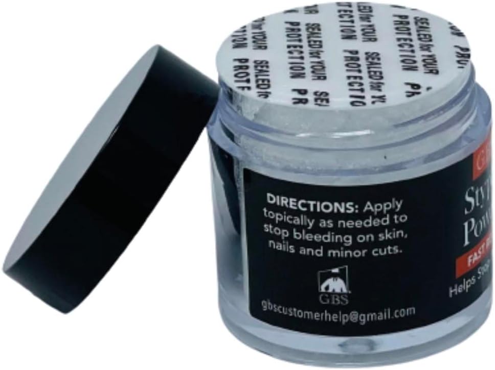 ABOUT THE PRODUCT: 1 > Stop bleeding in seconds from abrasions, lacerations, and wounds with wound seal powder 2 > This progressive powder combines with blood to form an immediate scab, sealing out dust and impurities to assist speed up healing 3 > Creates a protective scab that stops bleeding in seconds because it does not rely on clotting factorsG.B.S Styptic Powder 5G Twist off Cap and Protective Seal, Pack of 3