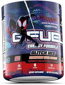 BULLET POINTS : 1 > INSPIRED BY SPIDER-VERSE: Grab a tub of G Fuel's Glitch Mix to kick your spidey senses into gear. Inspired by Spider-Man Across the Spider-Verse, this energy formula delivers a strawberry, guava, and coconut taste that any hero in the Spider-Verse will enjoy!