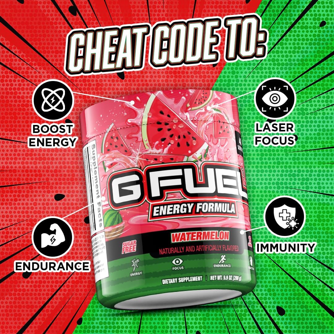 About this item WATERMELON FLAVOR: The quintessential "fruit of summerâ! The timeless taste, the iconic combination of juicy, watery, sweet, yet subtle fruity notes. This is what makes up Watermelon G Fuel. ZERO SUGAR: Unlike other energy supplements, who rely on loads of sugar to provide you with a false sense of energy, we donât. Our energy drink powder is designed to enhance energy, focus, endurance and reaction, without the dreaded sugar crash. FOCUS AND ENERGY COMPLEX: Experience the unique advantage of G Fuel's caffeine powder. We combine 140 mg of caffeine with a focus amino to help enhance both concentration and mood, so you can absolutely crush any challenge ahead. ANTIOXIDANTS + VITAMINS COMPLEX: We use just the right balance of antioxidants that work in tandem with our vitamin complex (Vitamin C + Vitamin E + Vitamin B12 + Vitamin B6) to create a drink mix that can improve performance, as well as improve overall health. MAKE THE SWITCH TO CLEAN ENERGY: Whether it's for gaming, work, school, your workout, or daily pick-me-up, G Fuelâs sugar free, antioxidant-rich, focus-enhancing energy powders will give you the edge you need to power through your grind! Use our supplements as a pre gaming drink, pre workout, coffee alternative, and for much more! See more product details,WATERMELON FLAVOR: The quintessential "fruit of summerâ! The timeless taste, the iconic combination of juicy, watery, sweet, yet subtle fruity notes. This is what makes up Watermelon G Fuel,ZERO SUGAR: Unlike other energy supplements, who rely on loads of sugar to provide you with a false sense of energy, we donât. Our energy drink powder is designed to enhance energy, focus, endurance and reaction, without the dreaded sugar crash,FOCUS AND ENERGY COMPLEX: Experience the unique advantage of G Fuel's caffeine powder. We combine 140 mg of caffeine with a focus amino to help enhance both concentration and mood, so you can absolutely crush any challenge ahead,ANTIOXIDANTS + VITAMINS COMPLEX: We use just the right balance of antioxidants that work in tandem with our vitamin complex (Vitamin C + Vitamin E + Vitamin B12 + Vitamin B6) to create a drink mix that can improve performance, as well as improve overall health,MAKE THE SWITCH TO CLEAN ENERGY: Whether it's for gaming, work, school, your workout, or daily pick-me-up, G Fuelâs sugar free, antioxidant-rich, focus-enhancing energy powders will give you the edge you need to power through your grind! Use our supplements as a pre gaming drink, pre workout, coffee alternative, and for much more!