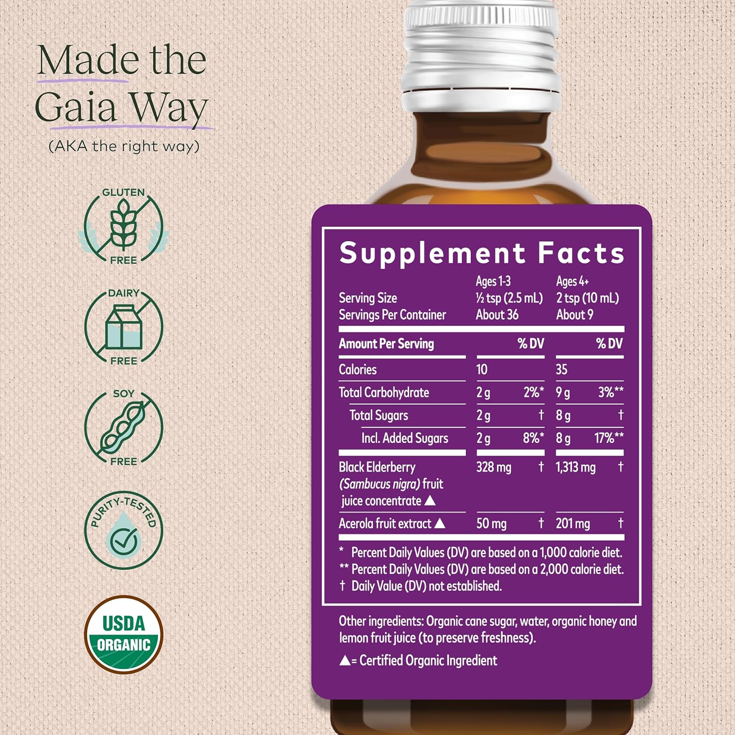 Our Delicious Elderberry Syrup Is Suitable For Everyday Use For The Whole Family. This Popular Formula Is Usda Certified Organic And Made With Only Organic Black Elderberries. Ideal For Both Daily And Seasonal Immune Support, Our Black Elderberry (Sambucus Nigra) Syrup Is A Delicious And Potent Way To Maintain Immune Health All Year Long. Elderberries Have Been Traditionally Used For Functions Of The Gastrointestinal Tract, Supporting A Healthy Body Temperature And Perspiration During An Acute Immune Challenge, And For Supporting The Resilience Of The Body Throughout The Difficult Winter Months. Both Elderflower And Elderberry Are Rich In Polyphenols, Which Have Antioxidant Activity. Oxidative Stress Is Often Produced During An Immune Response, And Having Sufficient Antioxidant Storage In The Body May Help To Maintain The Health And Integrity Of Tissues. From Seed To Shelf, Gaia Is Deeply Committed To The Purity, Integrity, And Potency Of Each Product. Since Gaia Herbs Was Just A Seedling In 1987, We Have Focused On Connecting People, Plants, And The Planet To Create Healing. We Use Only Organic Methods To Cultivate More Than 6.5 Million Plants Each Year. That Same Organic Approach Continues Throughout Our Manufacturing. We Use Patented Technology To Achieve The Highest Efficacy Of Each Herb. We Are A Company Devoted To Transparency. We Have Created Gaia’S Meetyourherbs Platform, One Of The World’S First And Only Herb Traceability Programs, Allowing Consumers To Learn About And Engage With Their Organic Herbs. We Are Able To Source Premium Ingredients So You Always Know What'S In Your Supplement. As A Certified B Corporation, We Are Actively Working Toward Building A More Inclusive And Sustainable World. We Nurture Healthy Connections Between Plants And People By Encouraging Strong Relationships And Championing Environmental Sustainability Within The Communities That We Work With Around The World