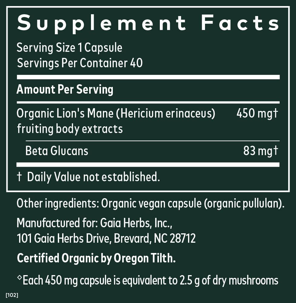 Gaia Herbs, Lions Mane Mushroom, 40 Count