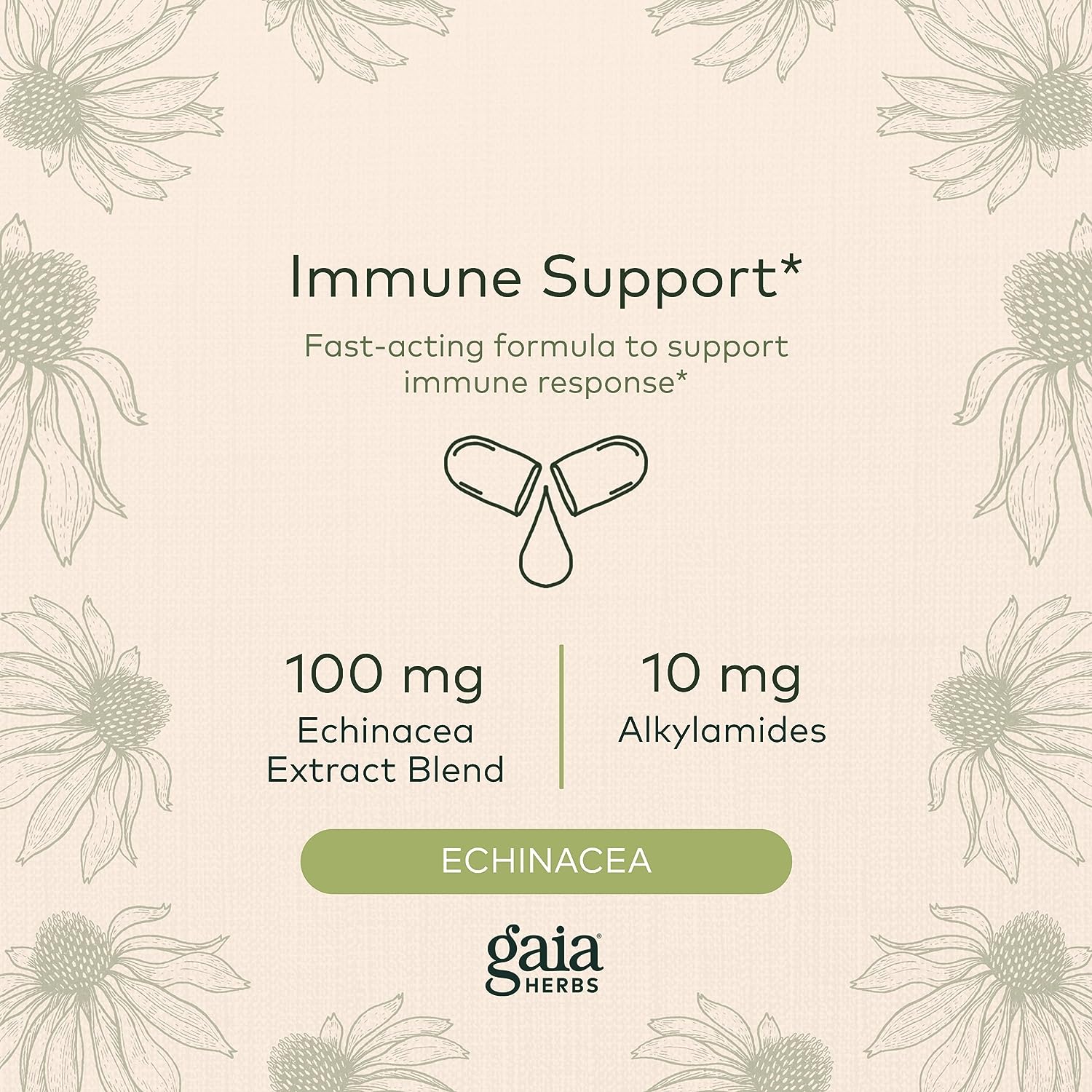 Gaia Herbs Quick Defense Provides Rapid Immune Support At Onset Of Immune Challenges. This Fast Acting Herbal Immune Support Supplement Includes Our Proprietary Formula With 10Mg Alkylamides To Support A Healthy Inflammatory Response In The Sinuses, With Ginger For Added Support. Echinacea And Elderberry Support The Body’S Natural Defenses And Supports Cellular Health From Airborne Elements. We Suggest Taking 2 Capsules 5 Times Daily For 2 Days At The Onset Of Symptoms. Repeat If Necessary. Consider Quick Defense An Herbal Essential For Home, Travel, Or Whenever Immune Support Is Needed. From Seed To Shelf, Gaia Is Deeply Committed To The Purity, Integrity, And Potency Of Each Product. Since Gaia Herbs Was Just A Seedling In 1987, We Have Focused On Connecting People, Plants, And The Planet To Create Healing. We Use Only Organic Methods To Cultivate More Than 6.5 Million Plants Each Year. That Same Organic Approach Continues Throughout Our Manufacturing. We Use Patented Technology To Achieve The Highest Efficacy Of Each Herb. We Are A Company Devoted To Transparency. We Have Created Gaia’S Meetyourherbs Platform, One Of The World’S First And Only Herb Traceability Programs, Allowing Consumers To Learn About And Engage With Their Organic Herbs. We Are Able To Source Premium Ingredients So You Always Know What'S In Your Supplement. As A Certified B Corporation, We Are Actively Working Toward Building A More Inclusive And Sustainable World. We Nurture Healthy Connections Between Plants And People By Encouraging Strong Relationships And Championing Environmental Sustainability Within The Communities That We Work With Around The World