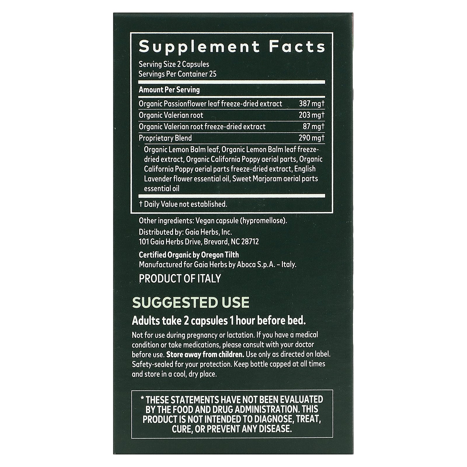 Sleep & Relax™ is produced in Tuscany, Italy, by Aboca, the herbal supplement leader in Europe since 1978. Gaia Herbs' partnership with Aboca is born from a mutual belief in sustainable product development, dedication to quality, and a deep respect for science and nature working in harmony.