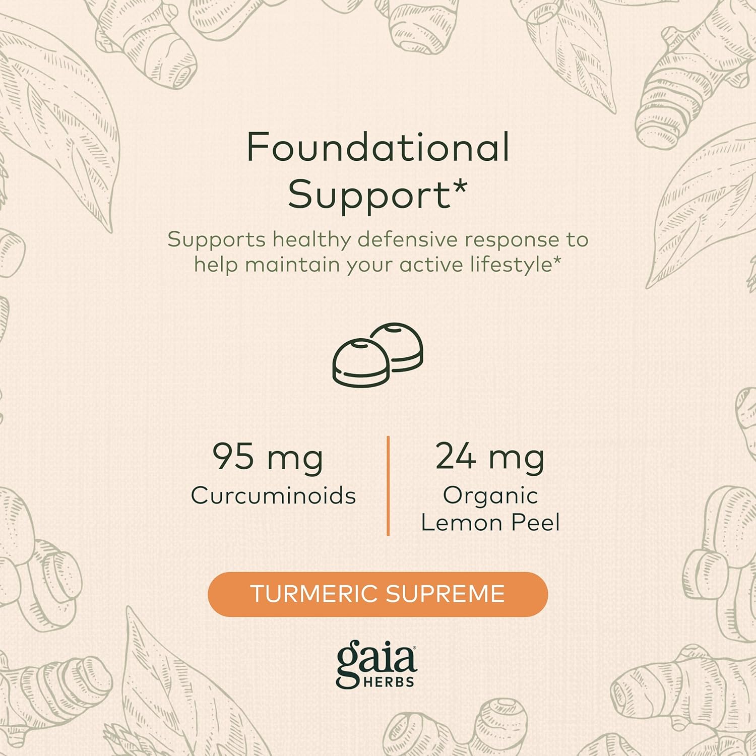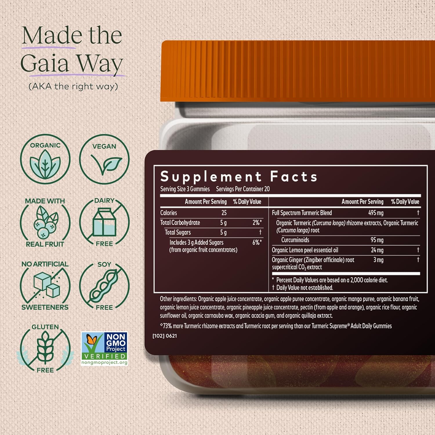 Turmeric, A Traditional Go-To For Thousands Of Years To Support Whole-Body Health, Is Now Available As A Gummy!* This Full Spectrum Extra Strength Formula Contains The Equivalent Of 6.6 Grams Of Turmeric And Provides 95Mg Of Powerful Curcuminoids Per Serving To Help Support Healthy Inflammatory Function. It'S Formulated For 24X The Absorption Of Normal Turmeric And More Bioavailability*. Gaia Herbs Turmeric Supreme Extra Strength Delivers The Benefits Of Turmeric In A Convenient And Delicious Gummy Sweetened Only With Real Fruit.* From Seed To Shelf, Gaia Is Deeply Committed To The Purity, Integrity, And Potency Of Each Product. Since Gaia Herbs Was Just A Seedling In 1987, We Have Focused On Connecting People, Plants, And The Planet To Create Healing. We Use Only Organic Methods To Cultivate More Than 6.5 Million Plants Each Year. That Same Organic Approach Continues Throughout Our Manufacturing. We Use Patented Technology To Achieve The Highest Efficacy Of Each Herb. We Are A Company Devoted To Transparency. We Have Created GaiaāS Meetyourherbs Platform, One Of The WorldāS First And Only Herb Traceability Programs, Allowing Consumers To Learn About And Engage With Their Organic Herbs. We Are Able To Source Premium Ingredients So You Always Know What'S In Your Supplement. As A Certified B Corporation, We Are Actively Working Toward Building A More Inclusive And Sustainable World. We Nurture Healthy Connections Between Plants And People By Encouraging Strong Relationships And Championing Environmental Sustainability Within The Communities That We Work With Around The World