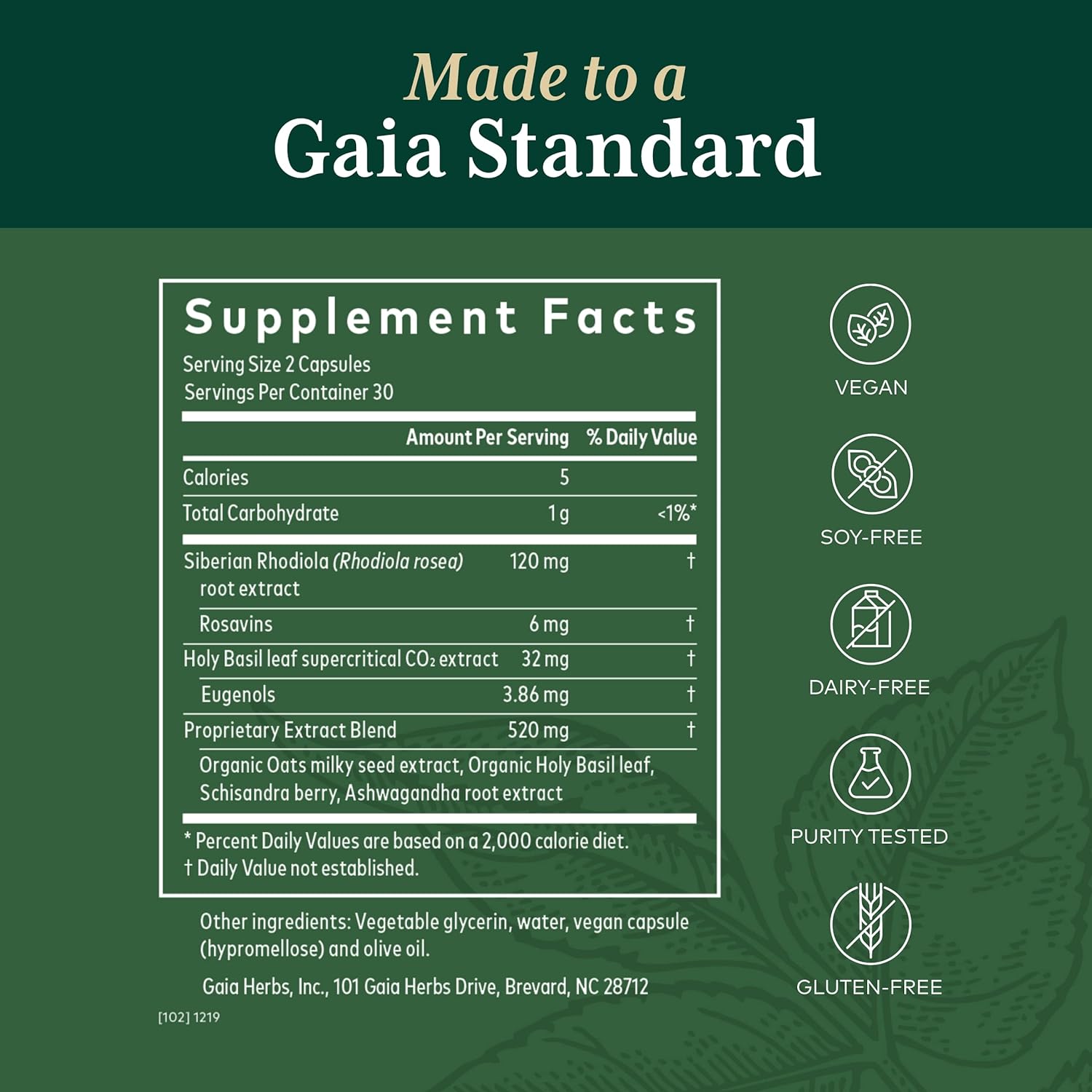 Adaptogen & Nervine Herbal Supplement: This stress supplement supports healthy cortisol levels; nervine herbs provide nervous system supportAdrenal Support & Health Supplement: Asian Ginseng supports adrenal health to restore balance to the body and help you cope throughout the dayPremium Ingredients: Formulated with Ashwagandha, Holy Basil, Oats, Rhodiola, and Schisandra for adaptogenic and nervine stress relief and adrenal health supportOur Commitment to Quality: We source the best ingredients from all over the world, including our own farms, for great quality, focusing on people and purpose and not just profit aloneAbout Gaia PRO: Our dedication to quality and integrity and tradition is unparalleled and meticulously driven by science while we strive to further the science of herbsStress is at the heart of many health conditions. When the body is stressed, your capacity to adapt is reduced, which can wreak havoc on the immune, nervous and inflammatory pathways. Optimizing adrenal gland function is essential to combating stress. Adrenal Support provides nourishment to the adrenals, enabling the body to adapt to stress in a healthy way