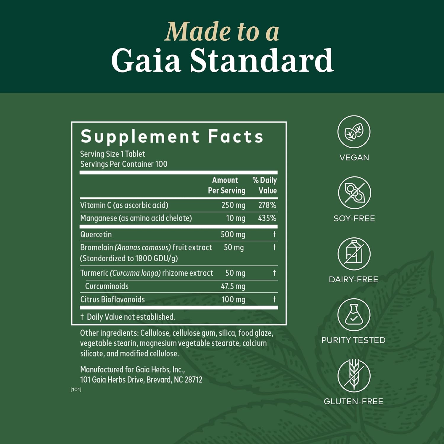 DESCRIPTION : Gaia PRO Quercetin Synergy 500- for Healthy Mast Cell Support - with Quercetin, Vitamin C, Manganese, Magnesium, Bromelain, Turmeric & More - 100 Vegan Tablets (100 Servings)