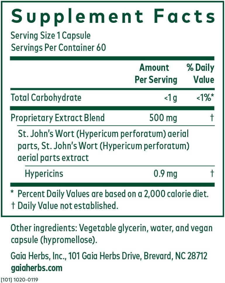 Supports well-being and a brighter outlook10Popular stress-support herb to help you keep on the sunny side10Convenient capsules for use at home or on the go101010Research has shown that St. John’s Wort extract may support positive health.* Each daily serving of Gaia Herbs’ fresh St. John’s Wort flowering buds delivers 1,350 mg of concentrated extract, with 2.7 mg of Hypericins — a dose consistent with that used in published research for providing nervous system support10