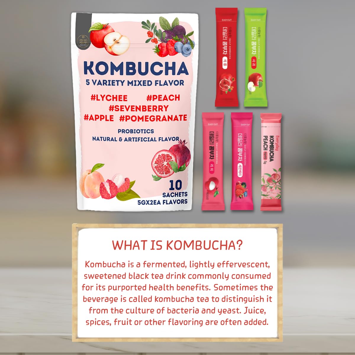 Garden Kombucha Tea, Powder 5G X 10 Sachets (50G/3.52Oz) Probiotics, Prebiotics, Sugar Free, Diet Tea, Healthy Drink (5 Variety Flavor)