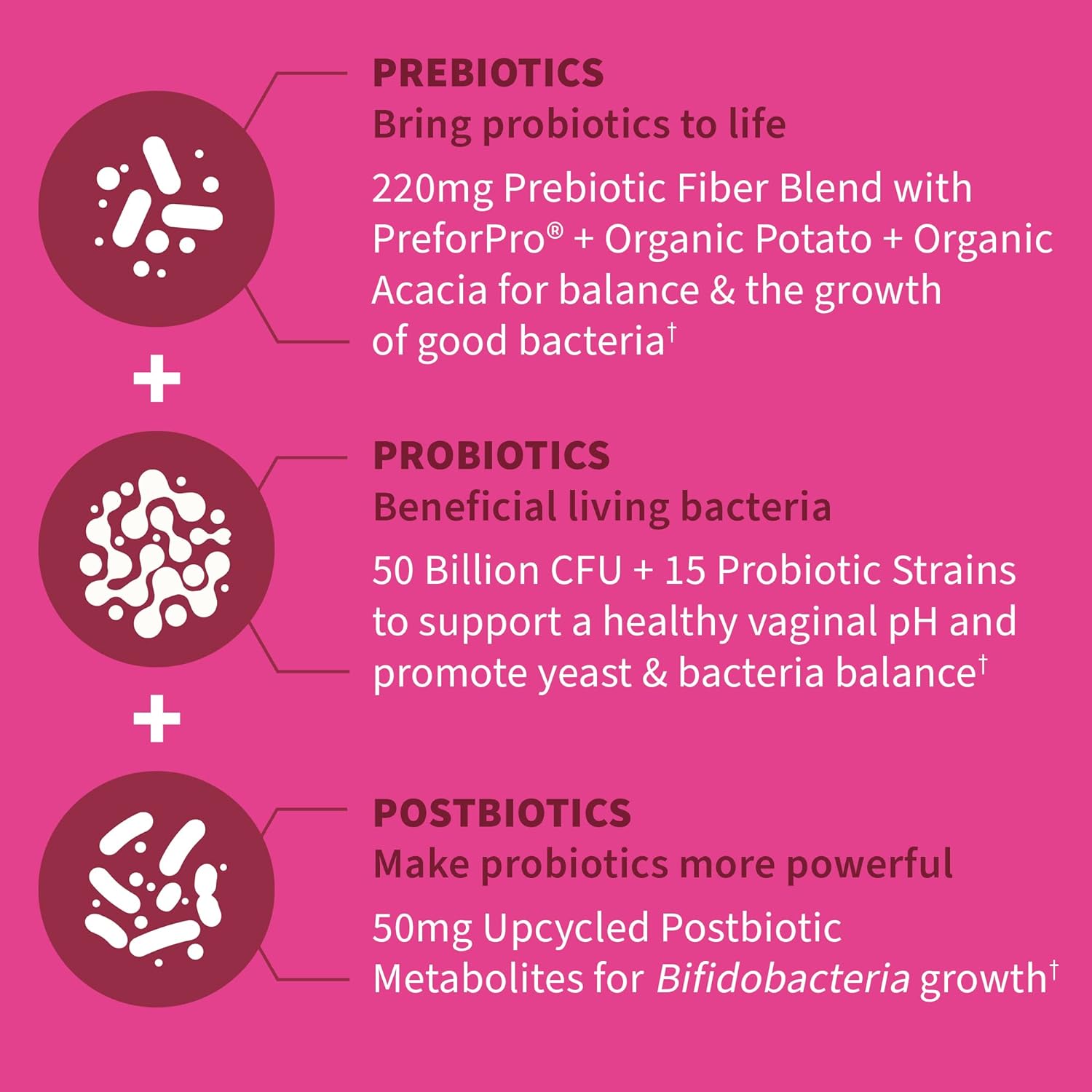 BULLET POINTS : 1 > THE WHOLE SHEBANG: Probiotics just got an upgrade; Meet the Dr. Formulated Women’s pH WHOLEbiotic, a triple action formula featuring Clinically proven prebiotics, Clinically Studied probiotics plus upcycled postbiotics—say that three times fast