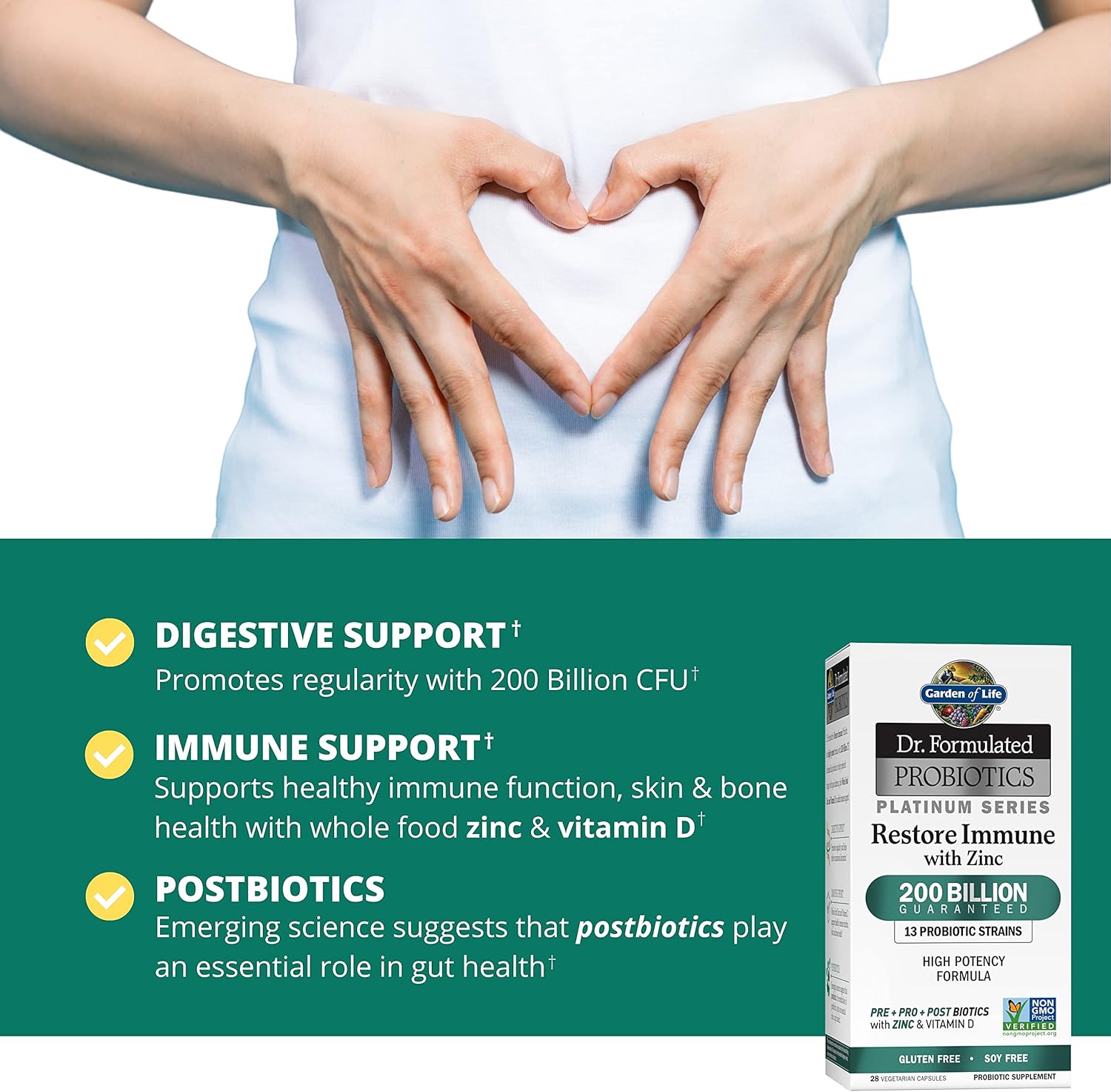 DESCRIPTION : Garden of Life Dr. Formulated Probiotics Platinum Series Restore Immune with Zinc and Vitamin D - 200 Billion CFU Guaranteed, Prebiotic Postbiotic Probiotic for Digestion, Immune Support, 28 Capsules